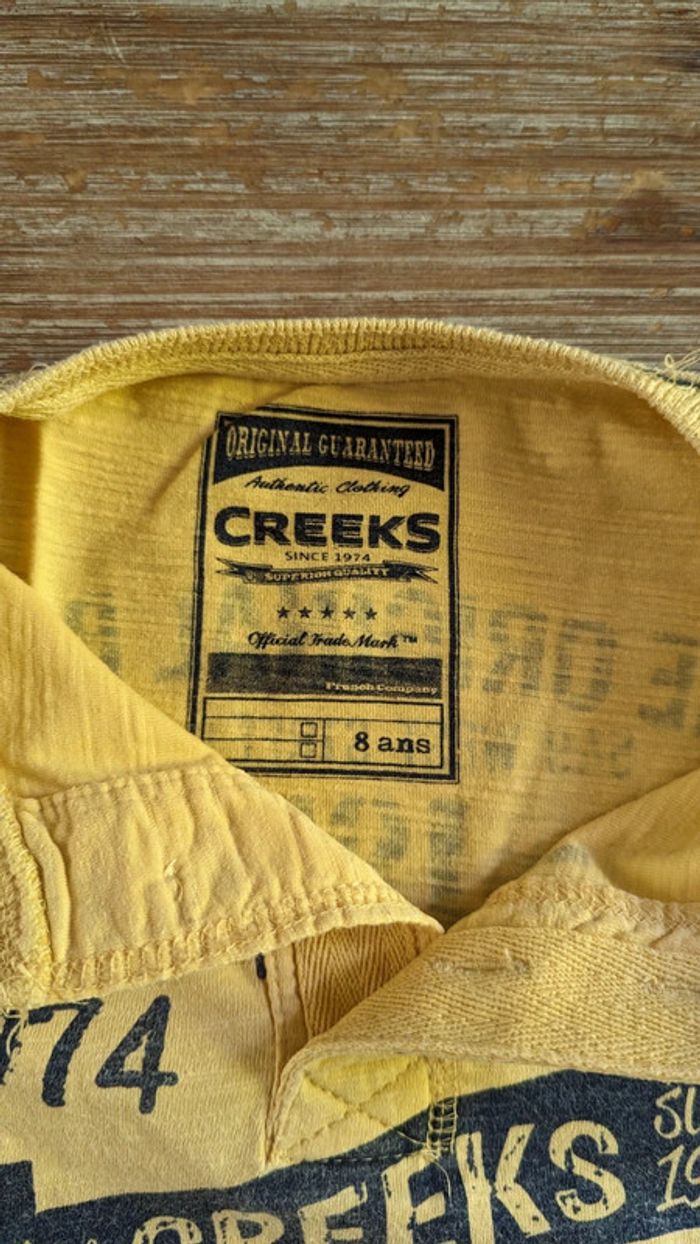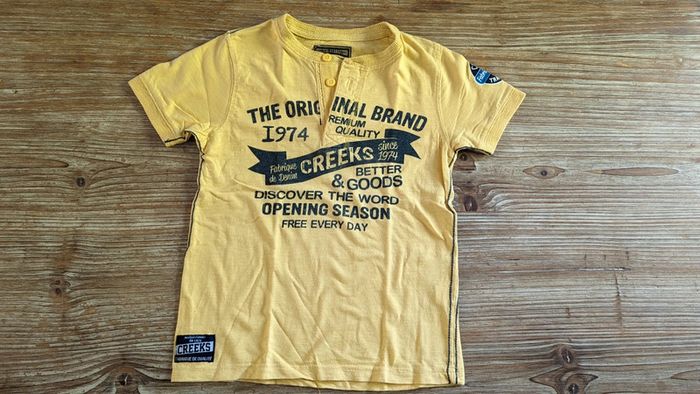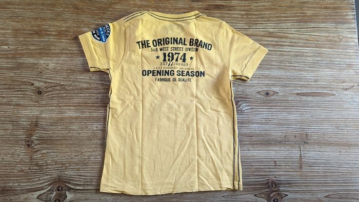 Tee shirt jaune avec des inscriptions grises. Col avec 3 boutons.