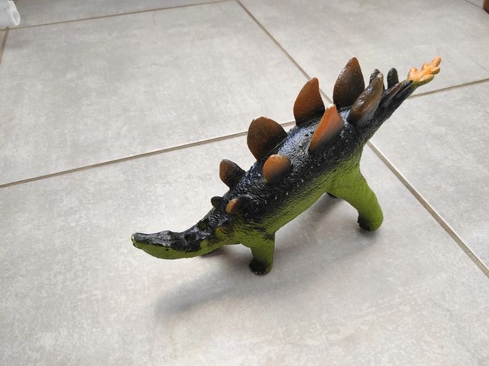Dinosaure qui fait 32 cm de long sur 13 cm de haut. Souple, on peut appuyer dessus quand on le prend en main.