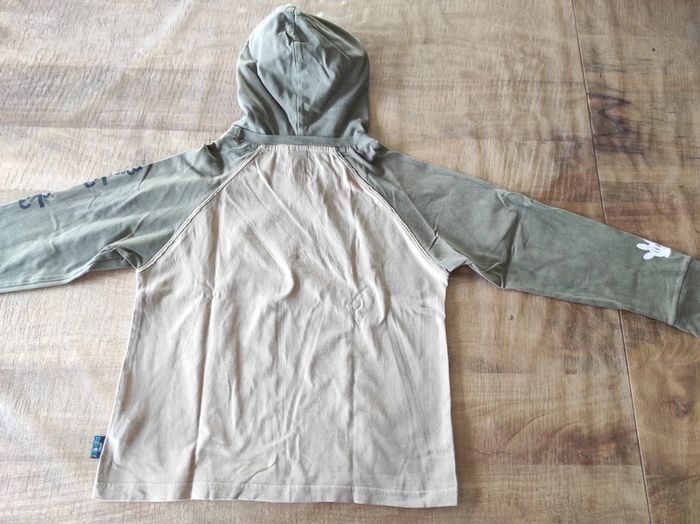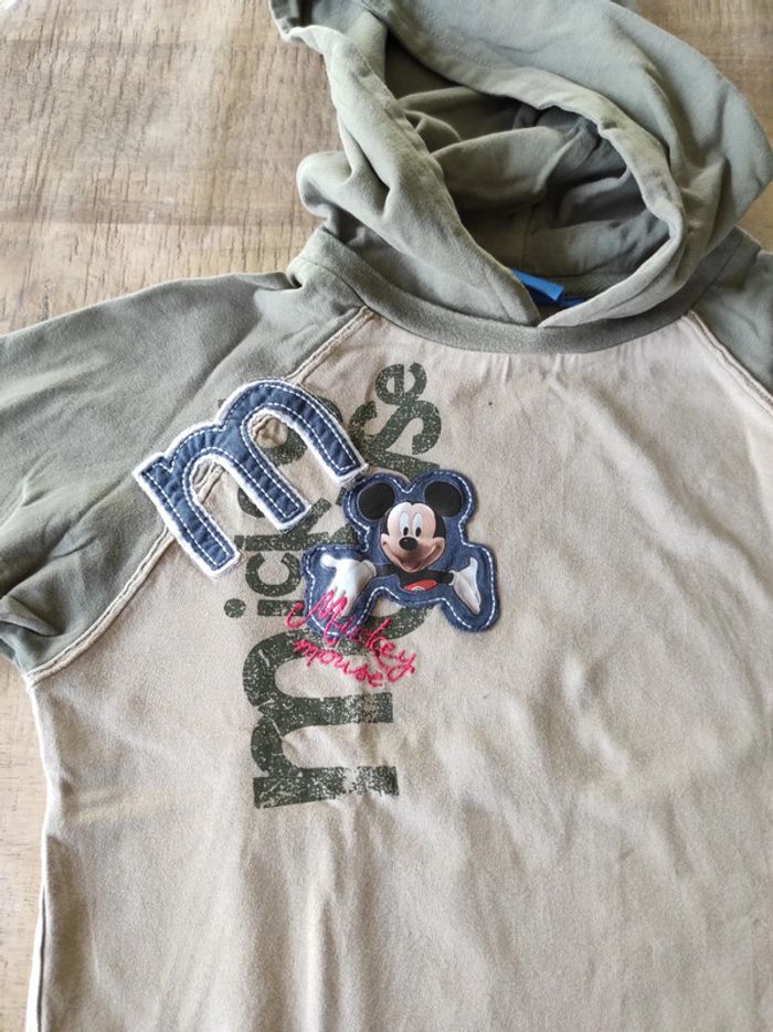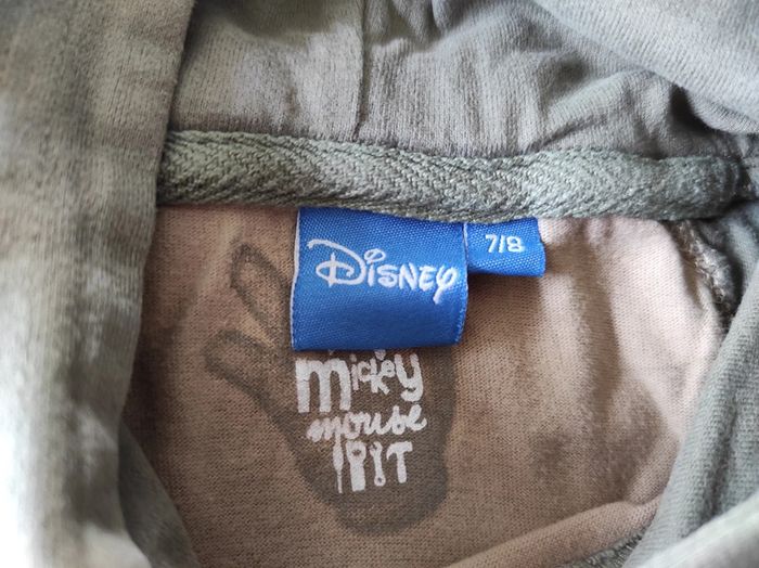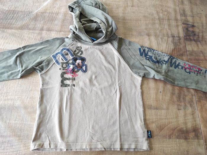 Pull à capuche beige et vert kaki Mickey. Très bon état. Taille 7/8 ans. 100% coton.