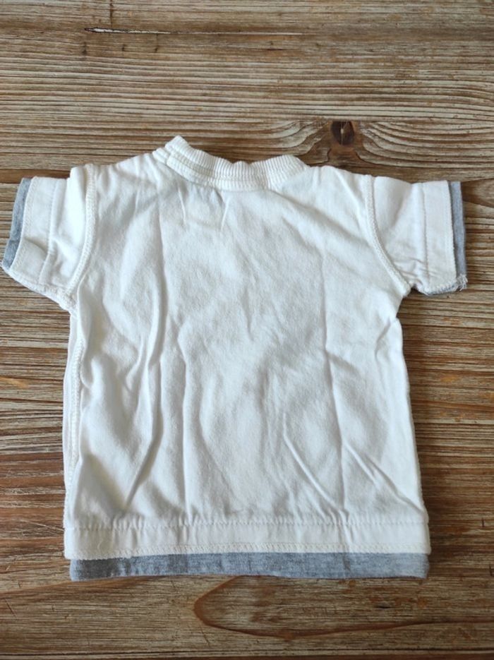 Tee shirt manches courtes crème et gris, effet superposition. Boutons sur l'épaule. Taille 3-6 mois, 68 cm, correspond plutôt à du 6 mois.