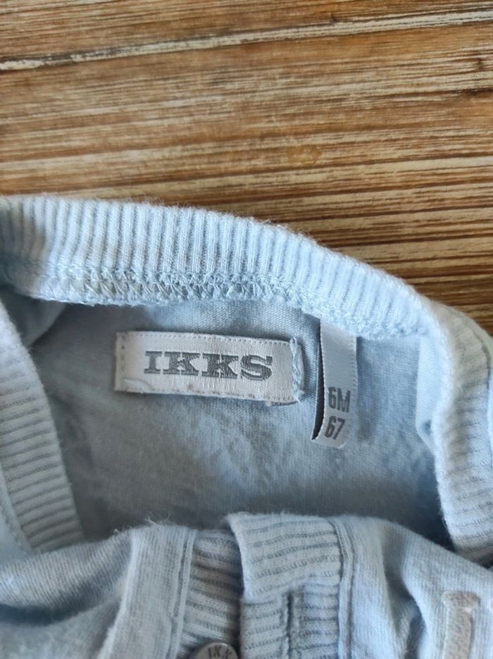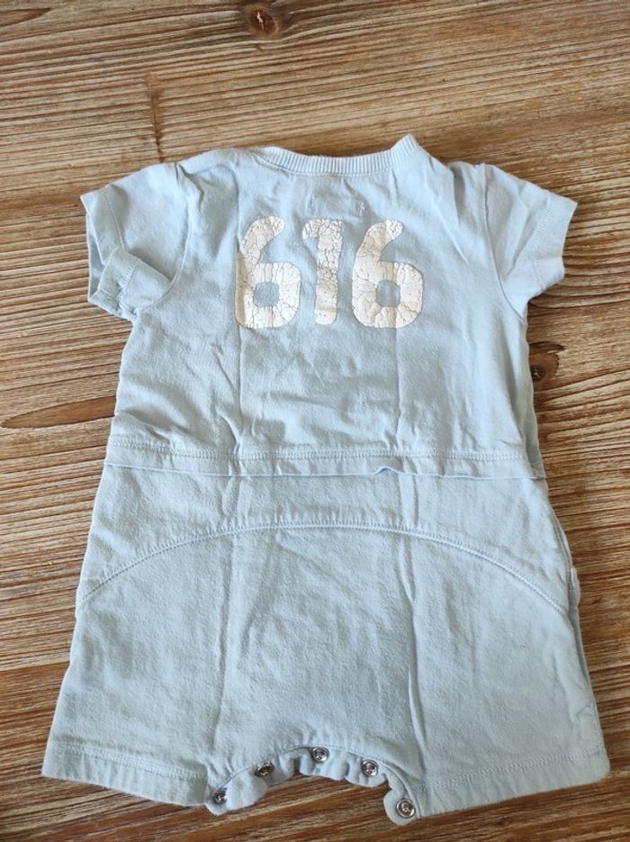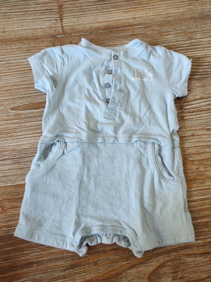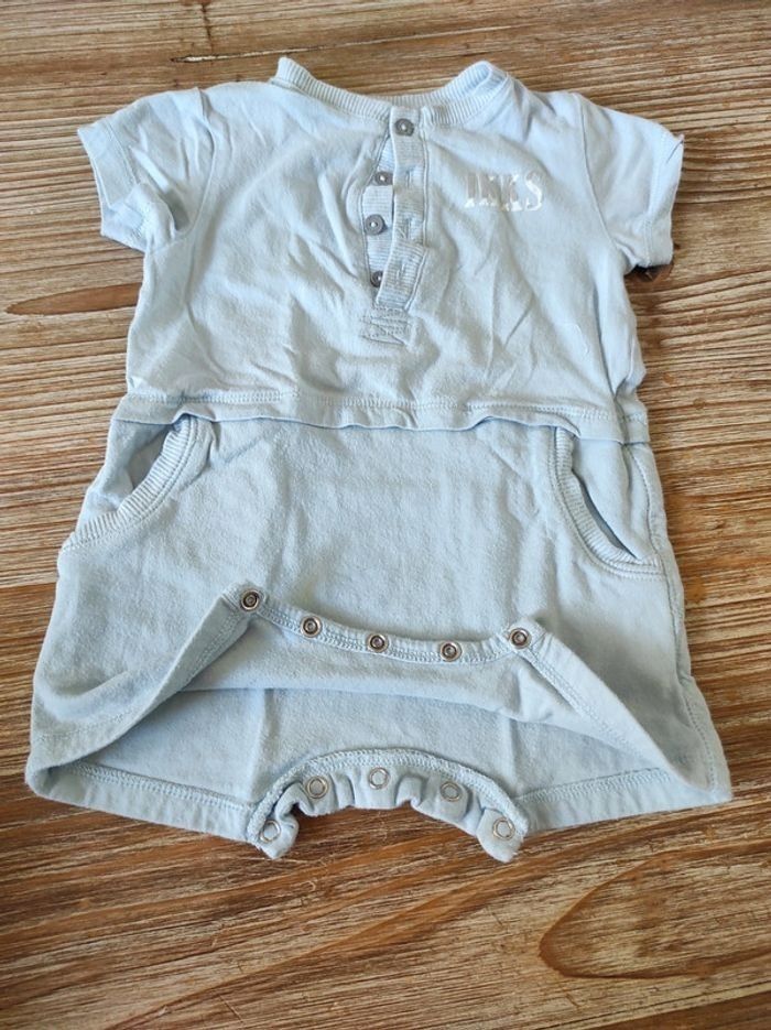 Combinaison manches courtes bleu ciel. Fermeture entrejambes avec boutons pression et boutons au col. Taille 6 mois.