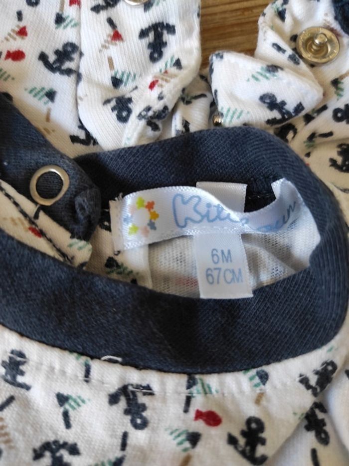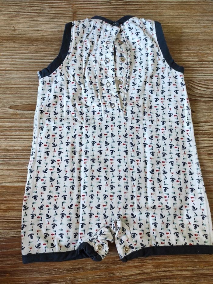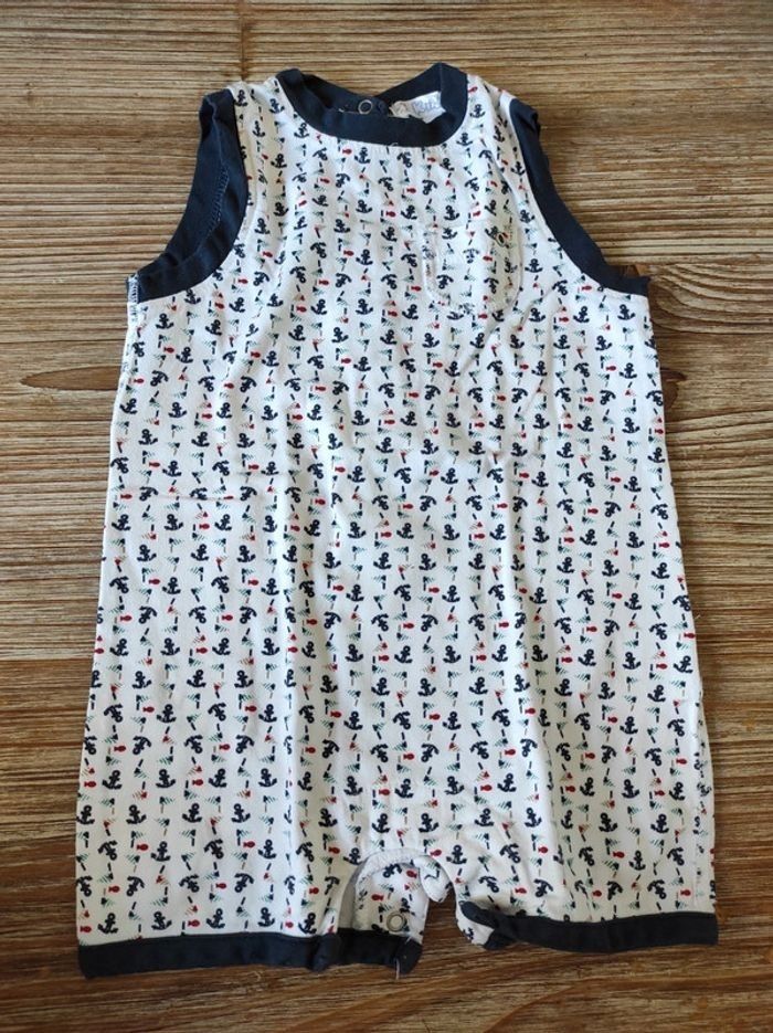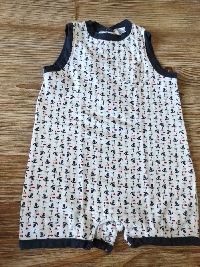 Combinaison blanche et bleue foncée avec des ancres marines. Ouverture entrejambes avec boutons pressions + en haut du dos. Taille 6 mois. Très bon état.