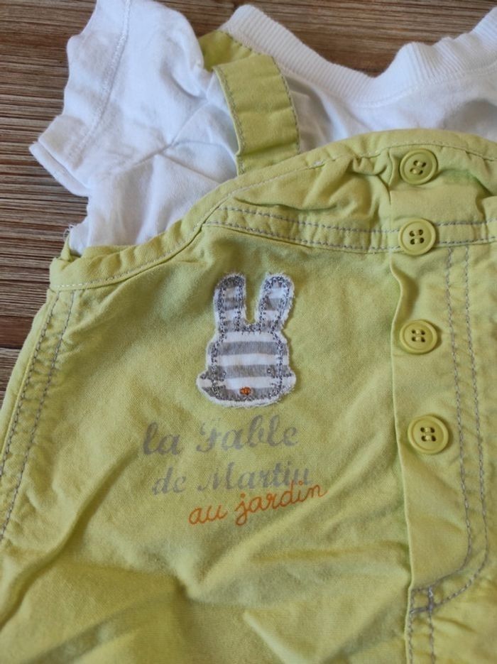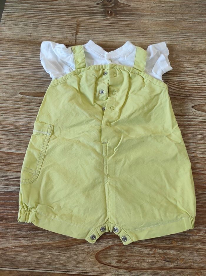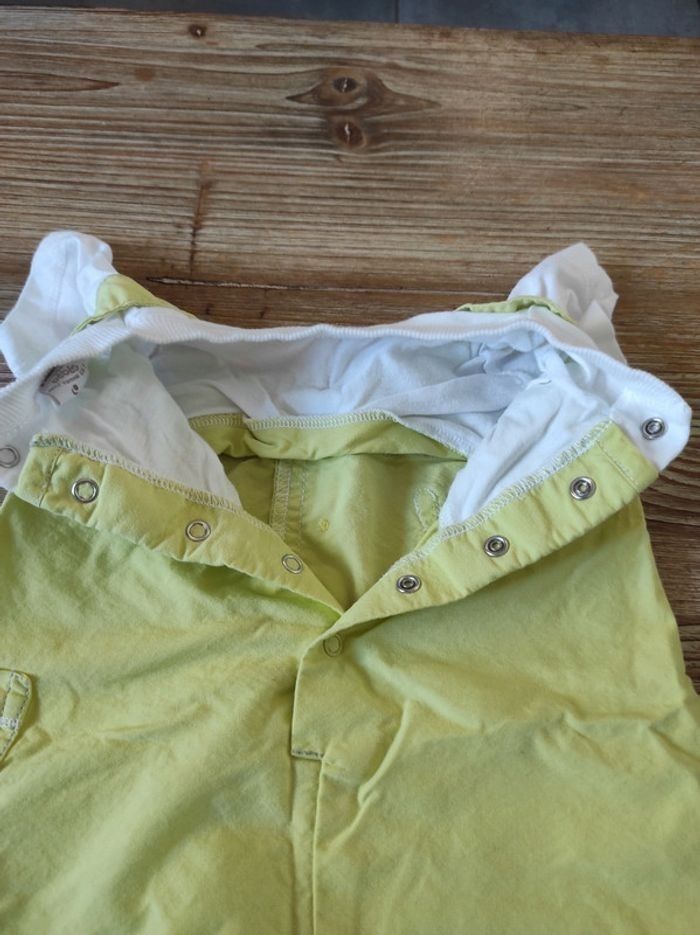 Combinaison vert clair et blanc: on a l'impression que c'est une salopette + un tee shirt mais en fait c'est une combinaison qui est d'un seul tenant. Ouverture dos et entrejambe avec boutons pressions. Taille 6 mois.