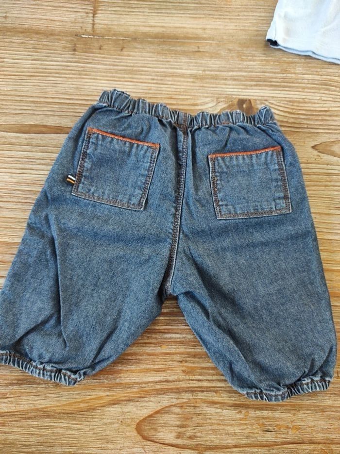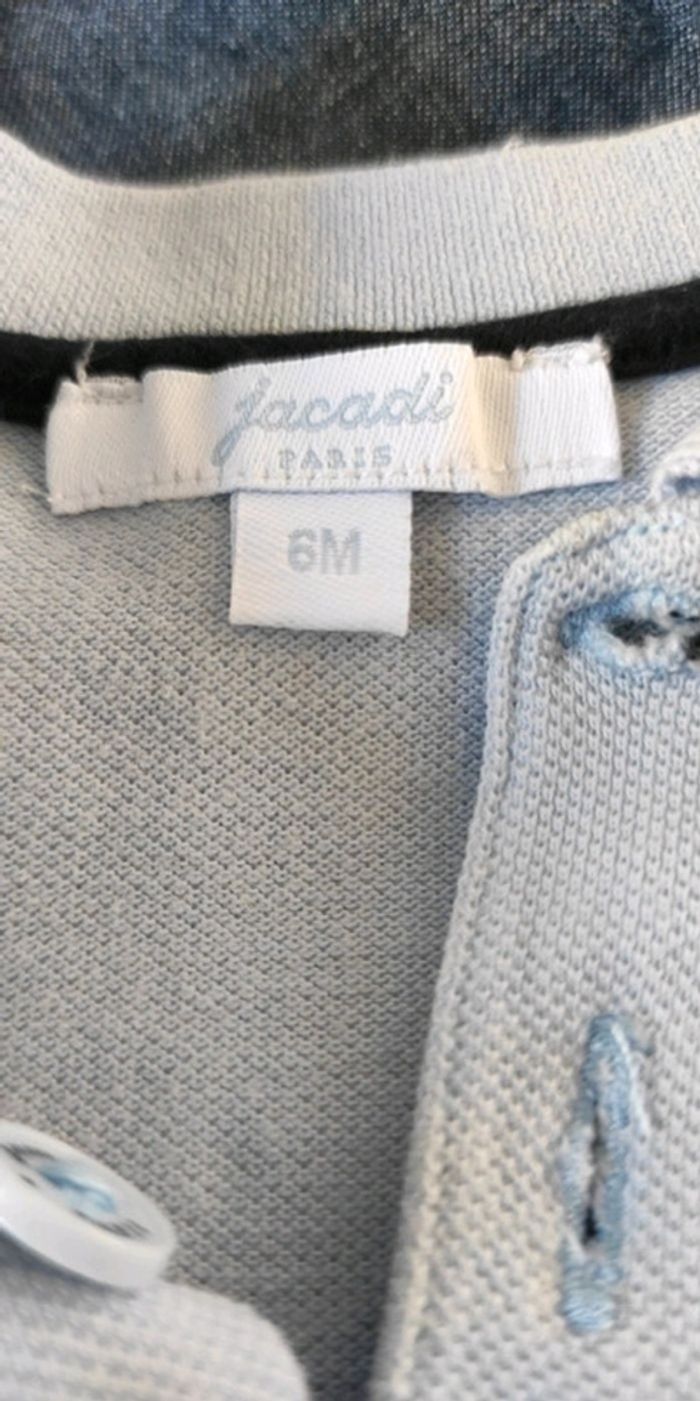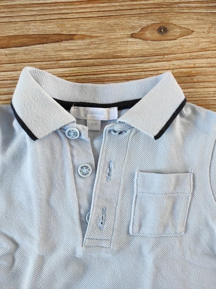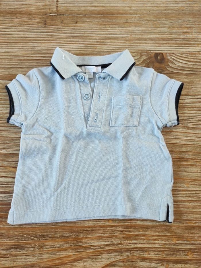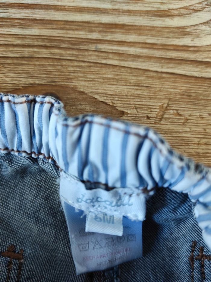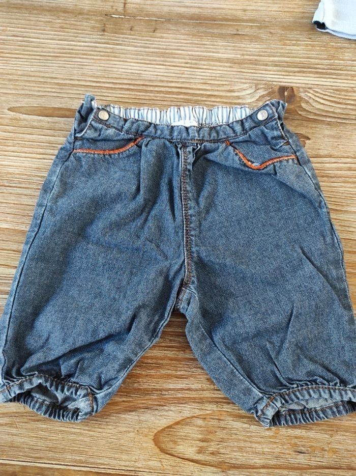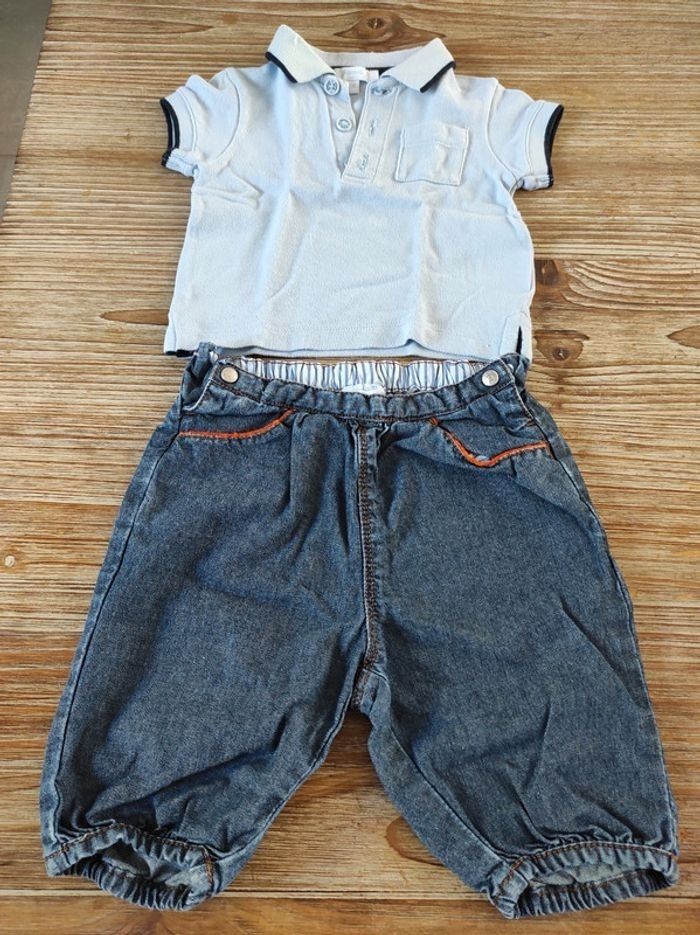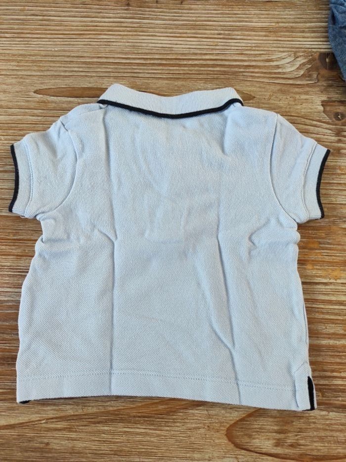 Short en jean léger fermeture sur les côtés avec boutons pression. Polo bleu ciel avec 3 boutons au col. A noter: quelques traces jaunes en dessous du col sur le côté droit du polo mais qui se voient peu selon l'exposition à la lumière (voir sur les photos). Taille 6 mois.