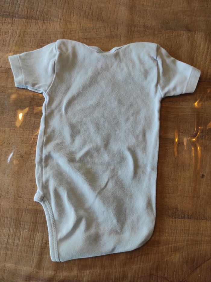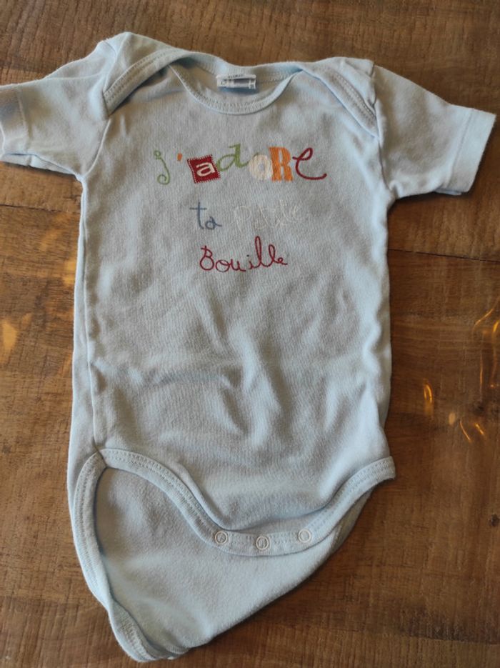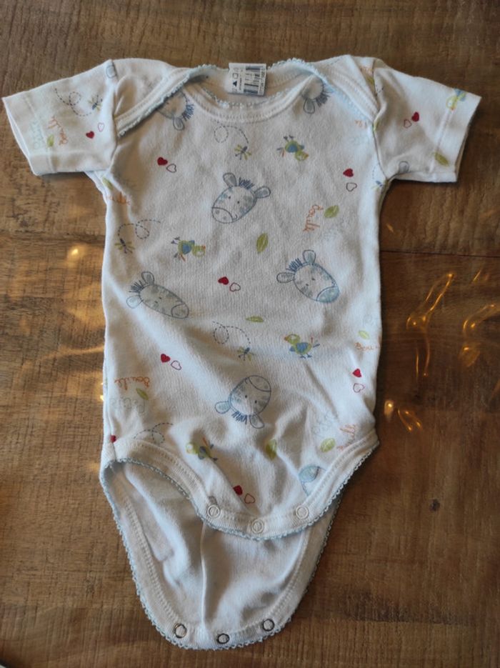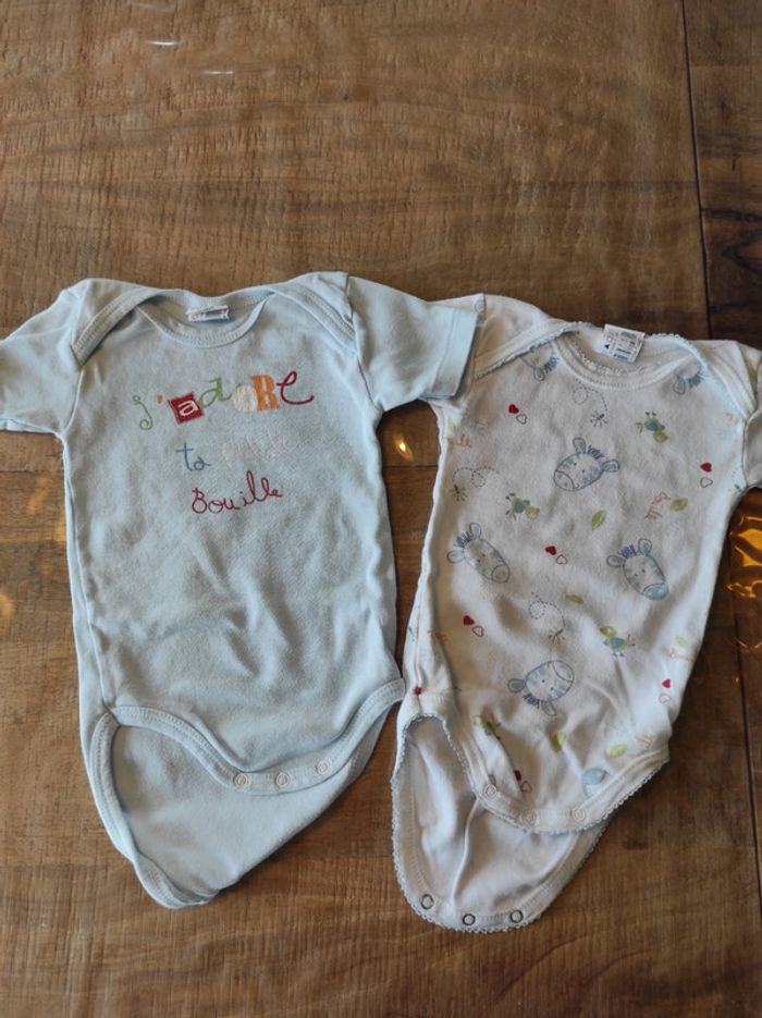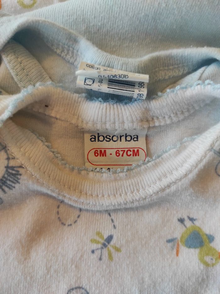 Lot de 2 bodies: 1 bleu clair et 1 blanc avec des dessins. Manches courtes, 3 boutons pression à l'entrejambe. Taille 6 mois, marque Absorba. Très bon état, pas de tâche, ni trou.