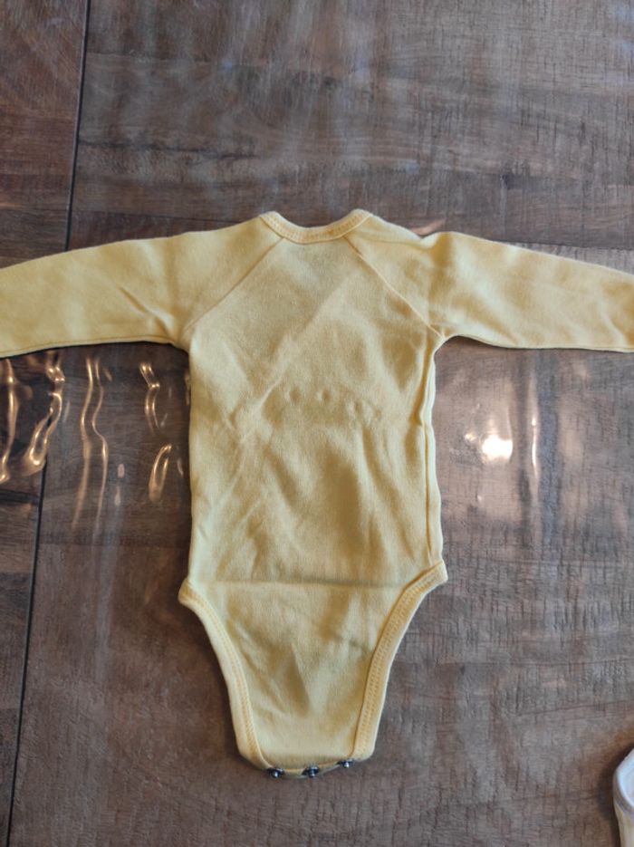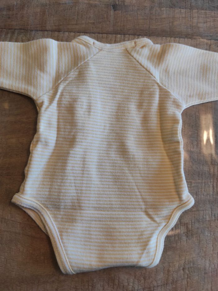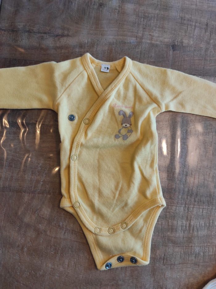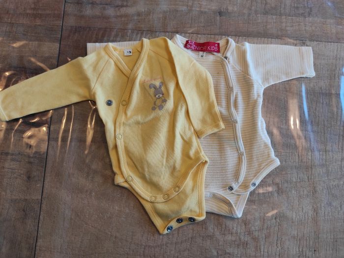 Lot de 2 bodies: 1 blanc rayé jaune, 1 jaune uni avec dessin d'un lapinou sur le devant. Fermeture sur le devant et entrejambe. Taille naissance, 50 cm.