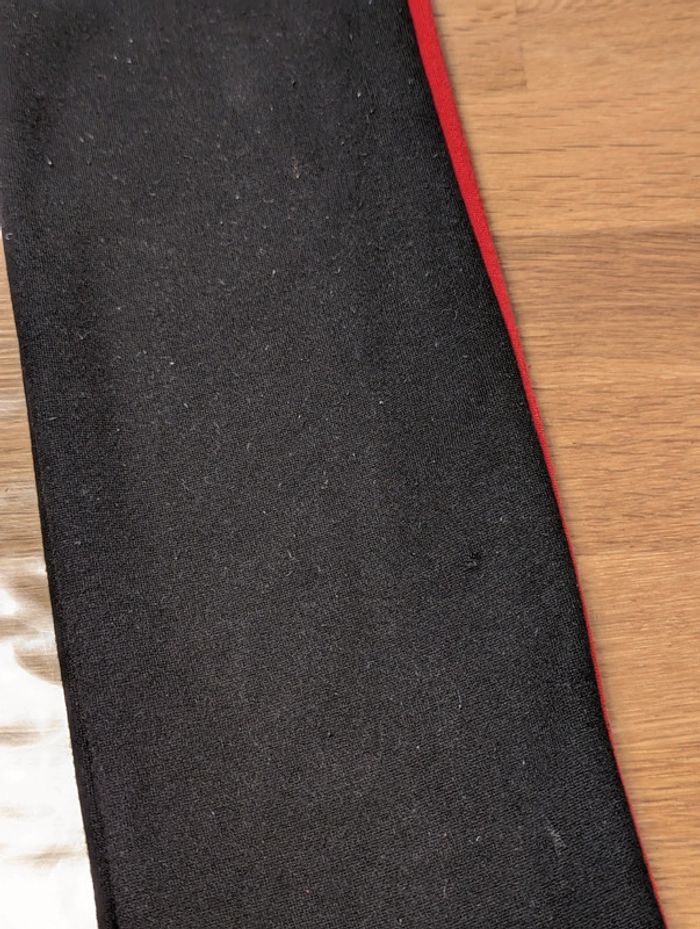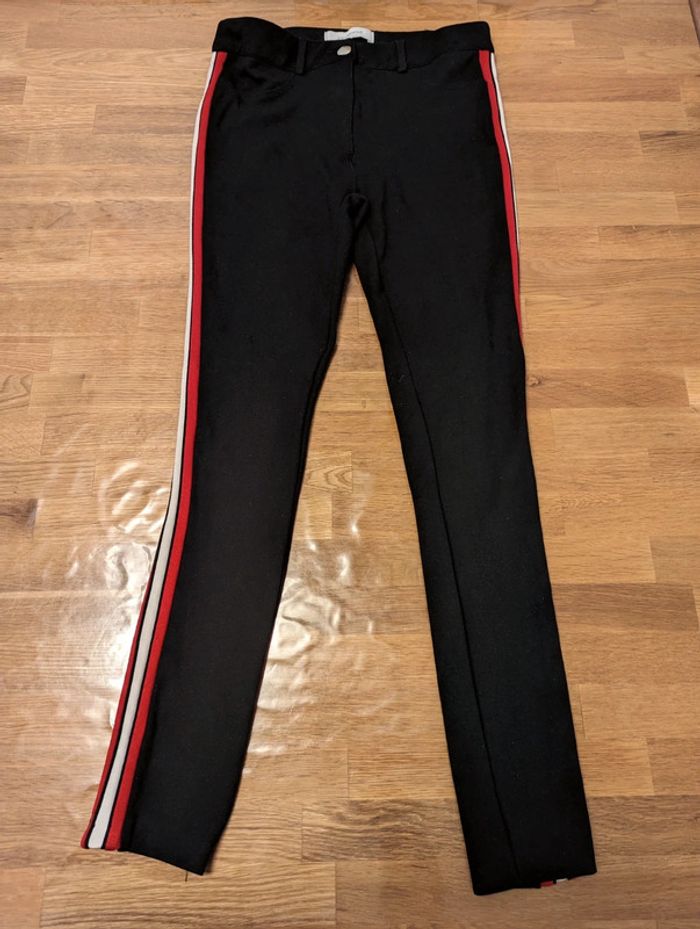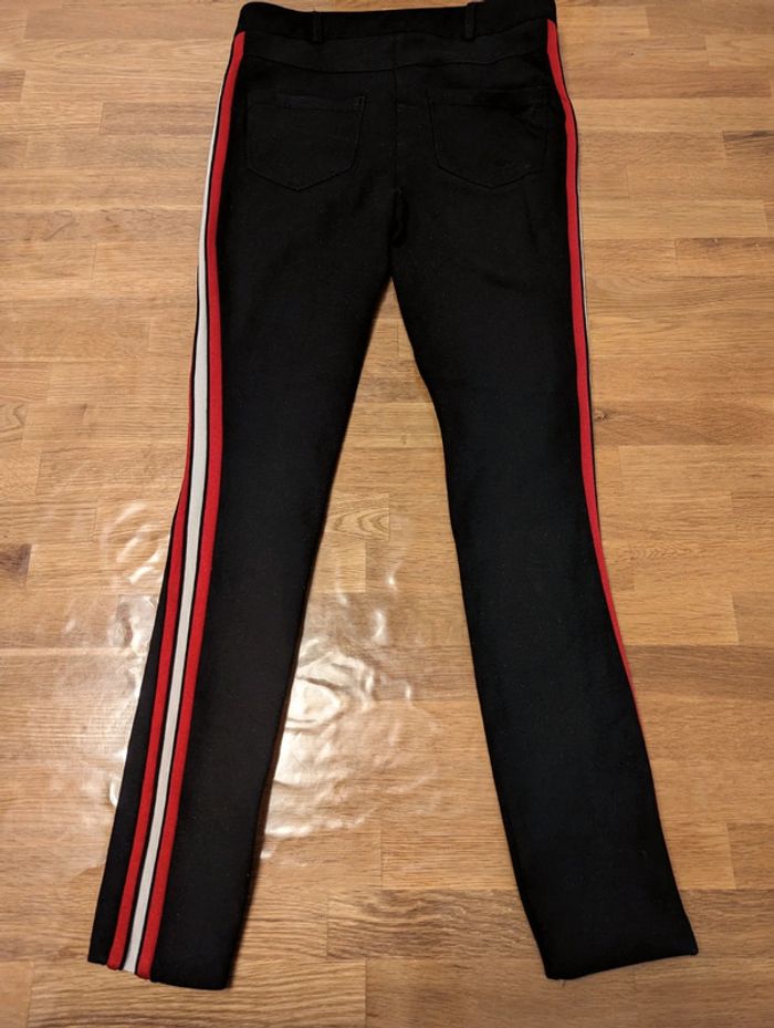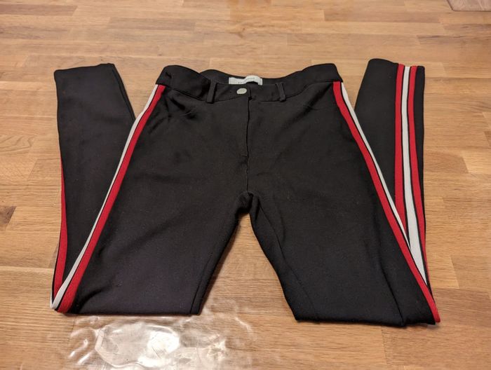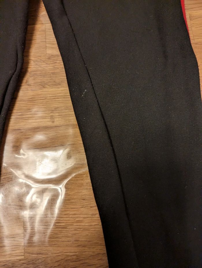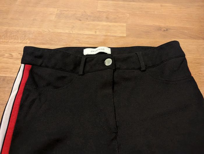 Pantalon fille femme environ taille 34 / 14 ans Promod Noir avec bandes blanche et rouge La taille est une estimation, il n'y a pas d'étiquette. Bon état général mais plusieurs défauts, voir photos, a été recousu sur le devant, un petit trou. #cellie89_fille14ans