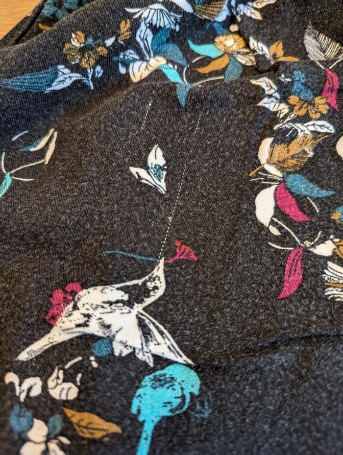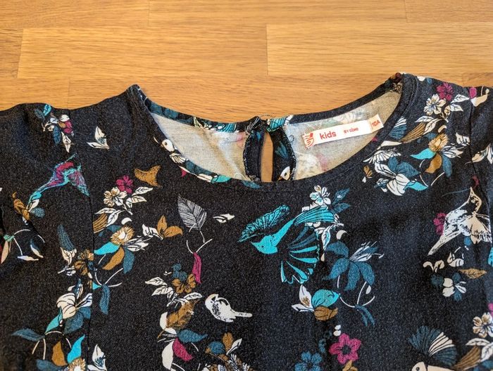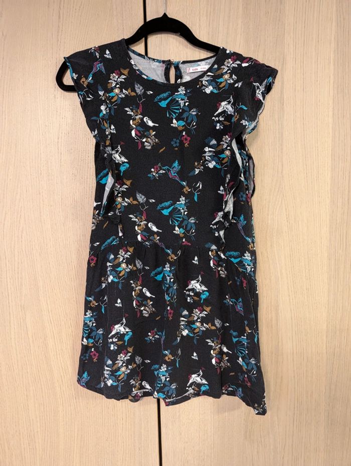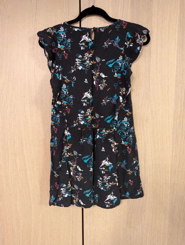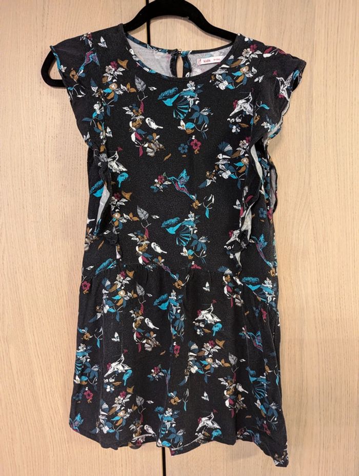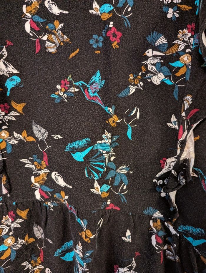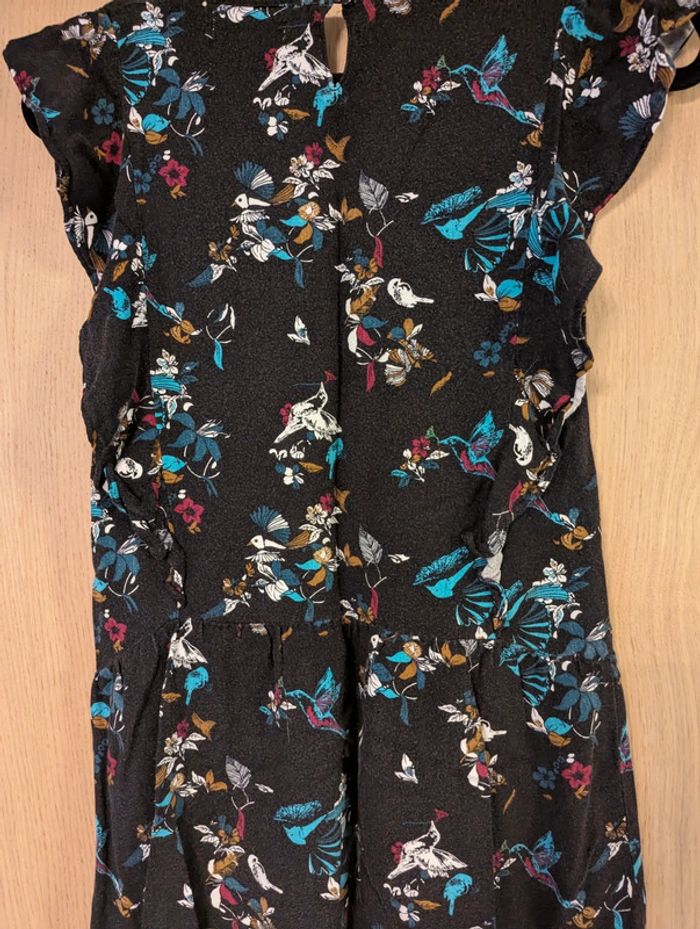 Robe fille 10 ans Gémo Beaucoup portée, noire, avec fleurs et oiseaux, blanc, vert, rose, turquoise, marron clair. Couleur passée. Taille grand , 100% viscose Voir photos. #cellie89_fille10ans
