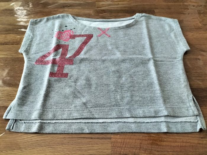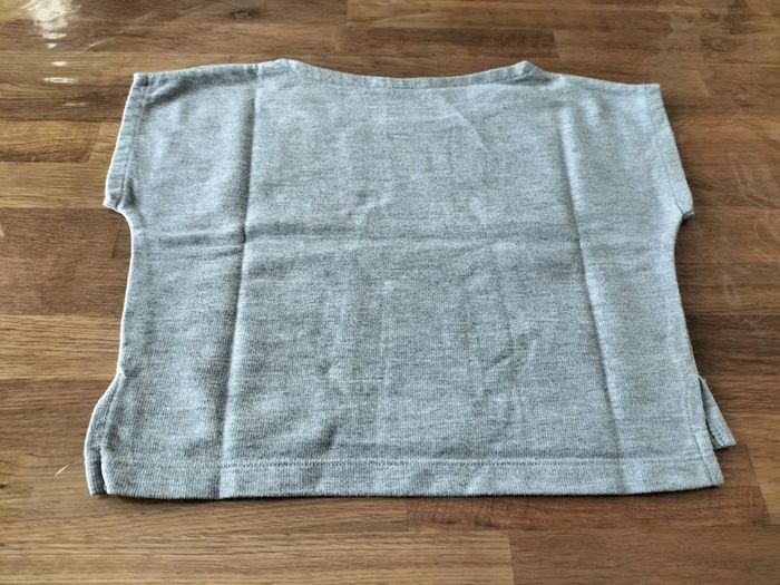 Pull court fille environ 6 ans Gémo, l'âge n'est pas mentionné sur le pull, bon état, gris, tissu léger. #cellie89_fille6ans