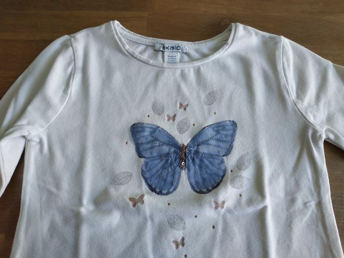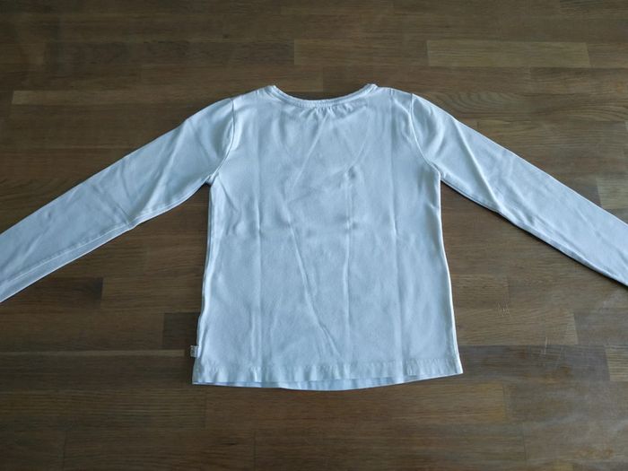 T-shirt fille 5 ans Okaïdi, blanc, très bon état, mais deux tâches estompées sur la manche droite. #cellie89_fille5ans