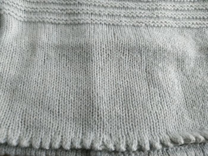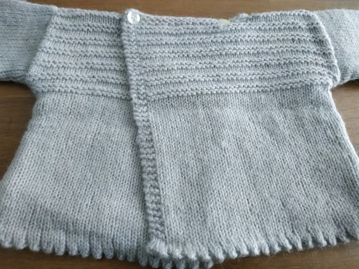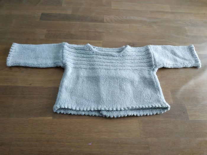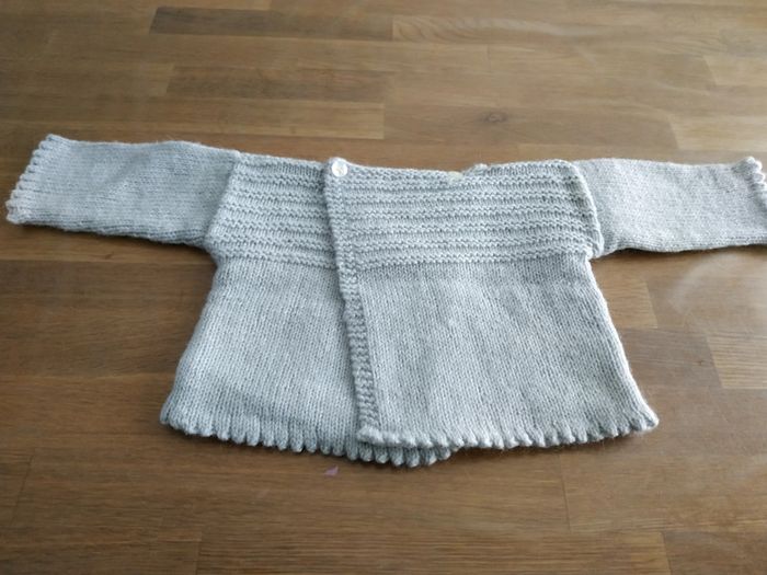 Brassière environ 3 mois fille Tricotée main, très bon état, gris/bleu clair. Se croise dans le dos. #cellie89_fille3mois
