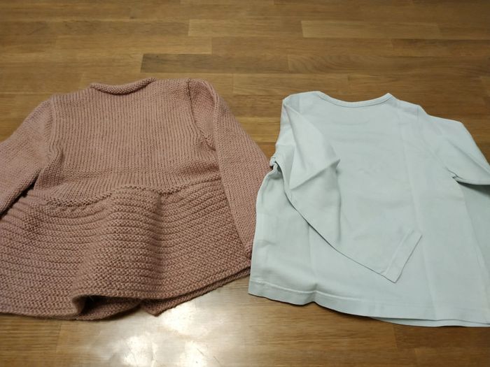 Gilet fille 18 mois tricoté main, excellent état, nombreux détails. Je donne avec, t-shirt Obaibi très bon état, tâche bras gauche au niveau de la couture et probablement une sur le ventre mais atténuée. Le prix ne tient compte que du gilet. #cellie89_fille18mois