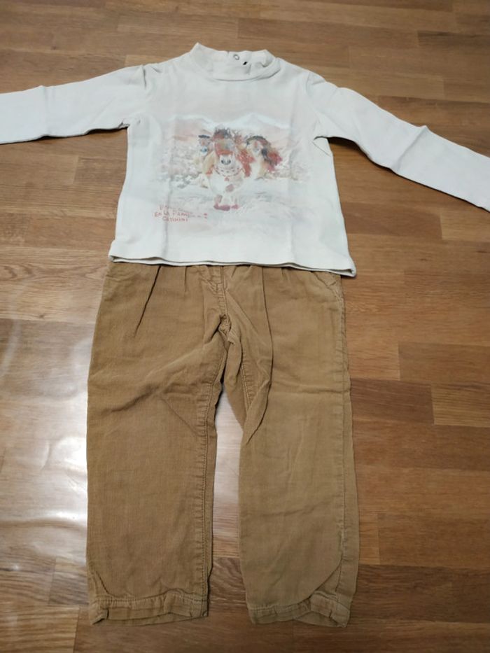 Ensemble fille 18 mois : Pantalon velours jaune moutarde, ceinture ajustable, excellent état, Bout'chou T-shirt col rehaussé, bon état, petite tâche à la manche, Catimini #cellie89_fille18mois