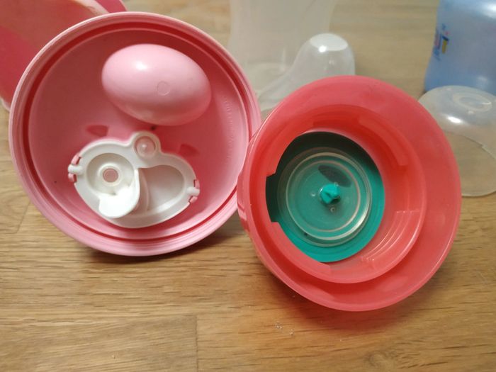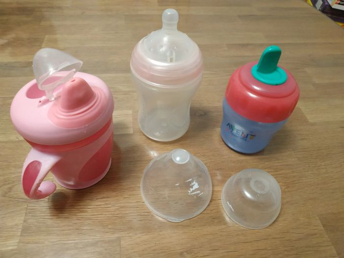 Lot biberons, 1 biberon, 2 verres avec tétines, système d'aspiration pour les 2, pour aider bébé à apprendre à boire comme un grand, possibilité de les enlever dès que bébé gère les débits seul. Bon état, ils ont tous leur bouchon. #cellie89_puericulture