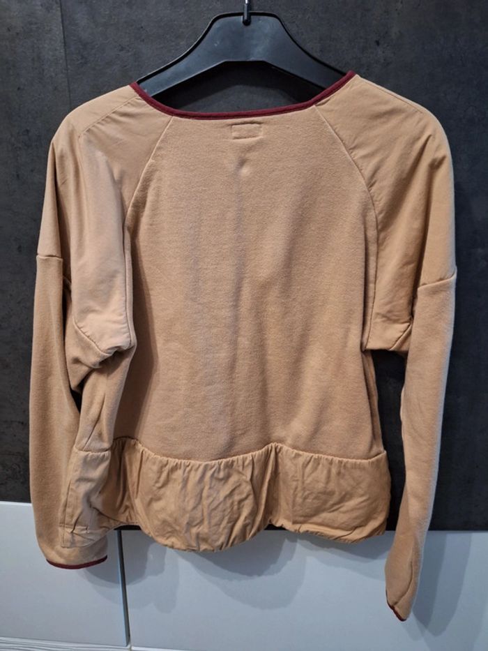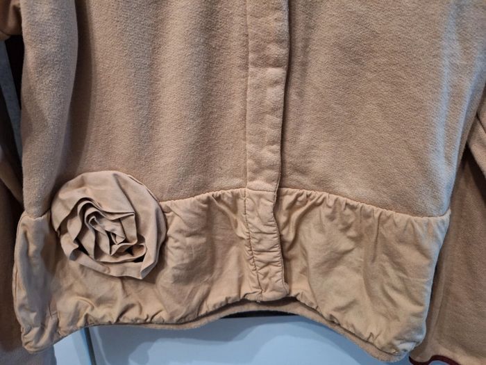 Gilet beige liserets bordeaux, fermeture par pressions, fleur devant, tissu sweatshirt, taille 10 ans, marque Marese, peu porté en très bon état