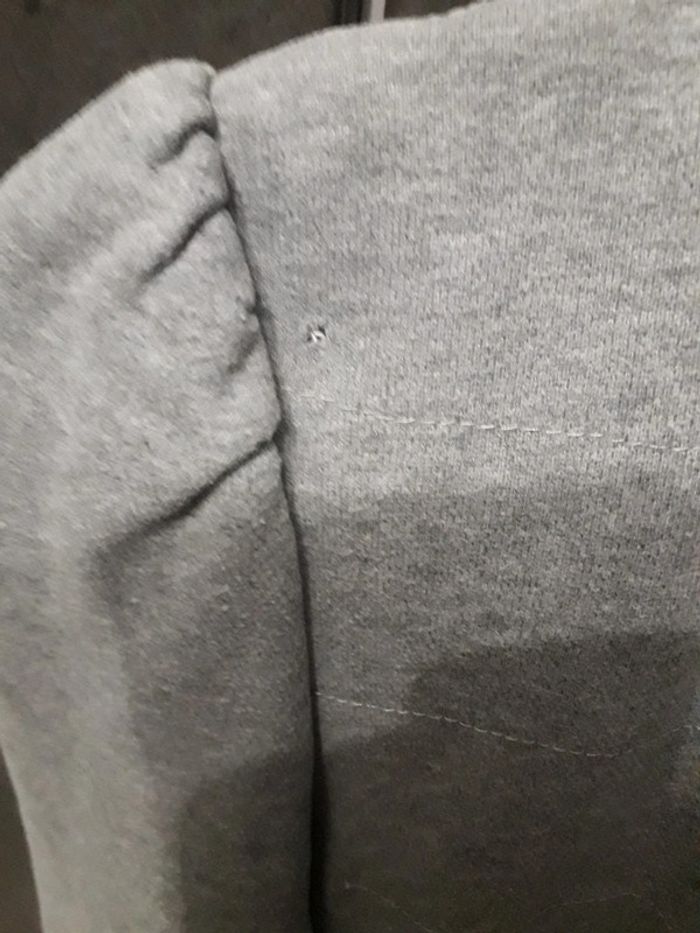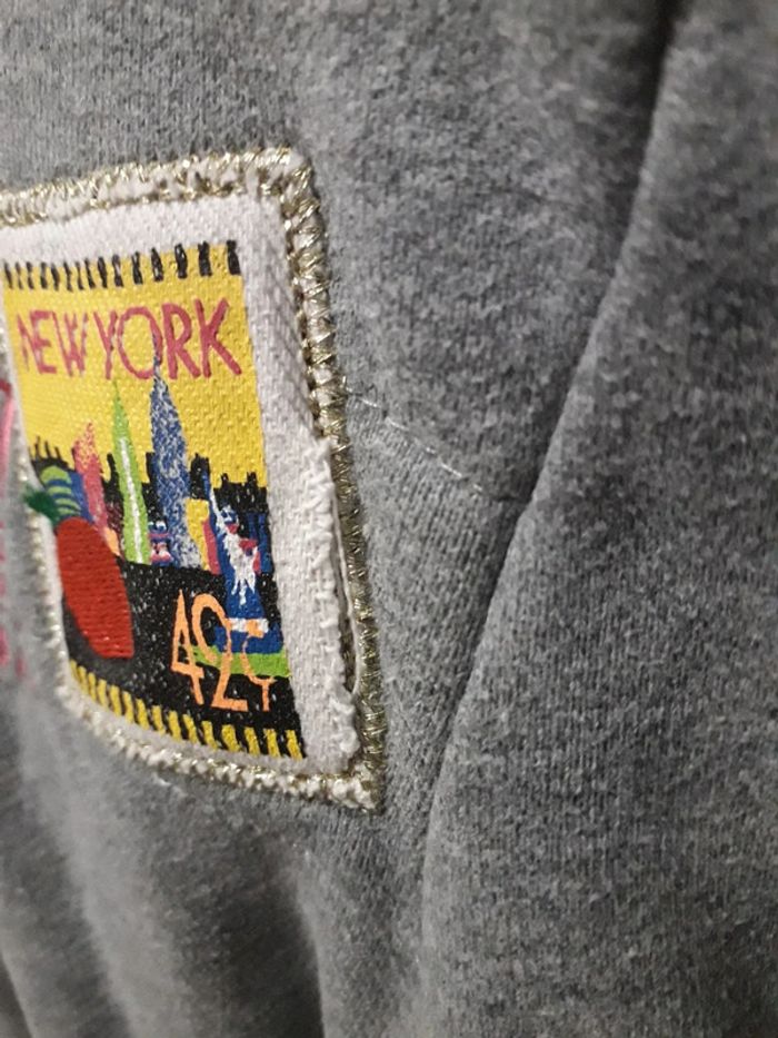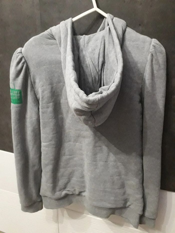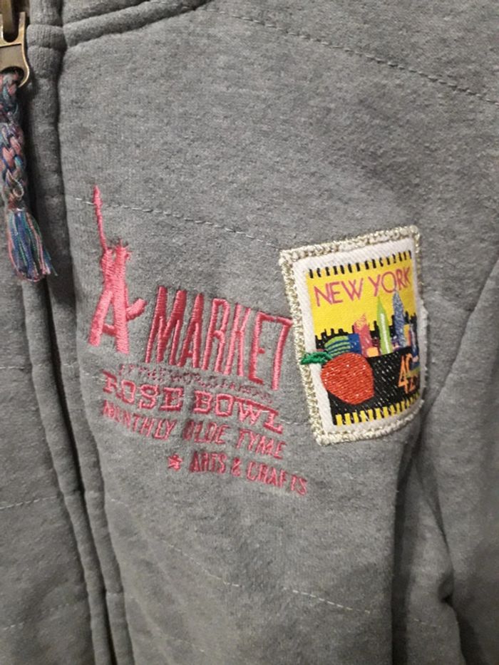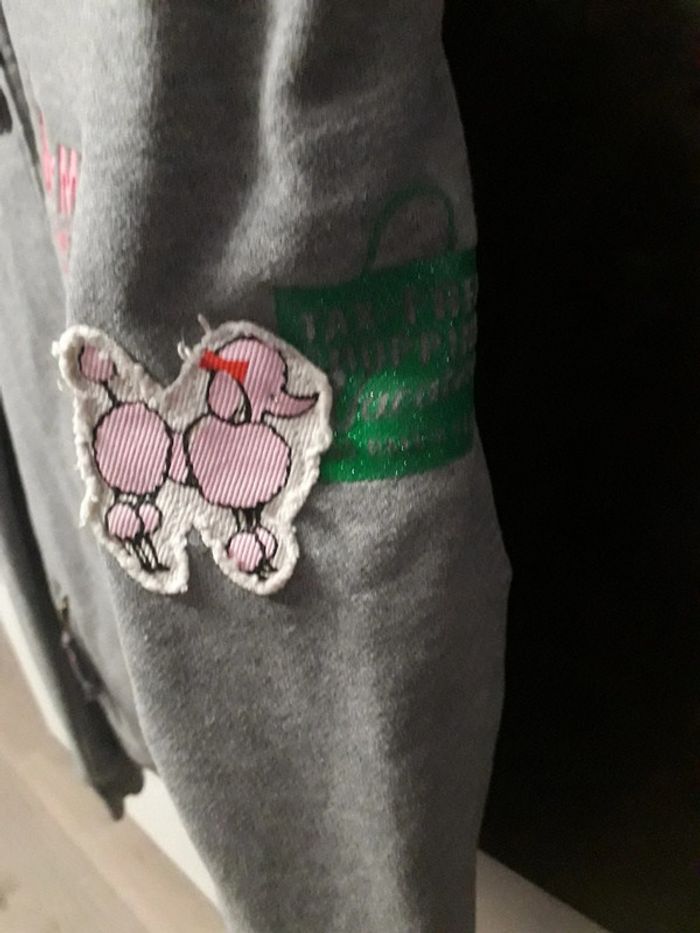 Gilet doublé bien chaud à capuche gris, 2 poches zippées devant, fermetures éclaires ok, écusson sur la poitrine un peu décousu (voir photo) + broderies roses, écusson caniche sur la manche, peu porté en bon état (juste un tout petit trou sur une épaule voir photo), taille 16 ans, marque CKS
