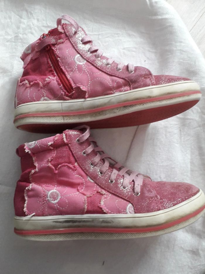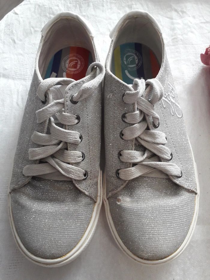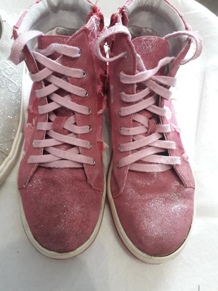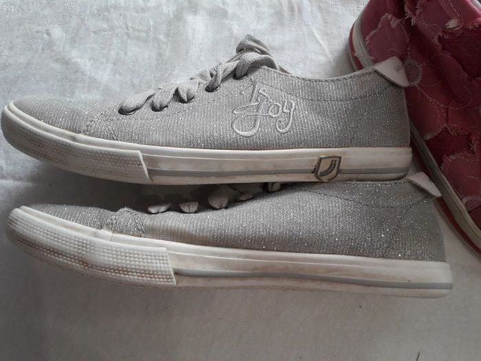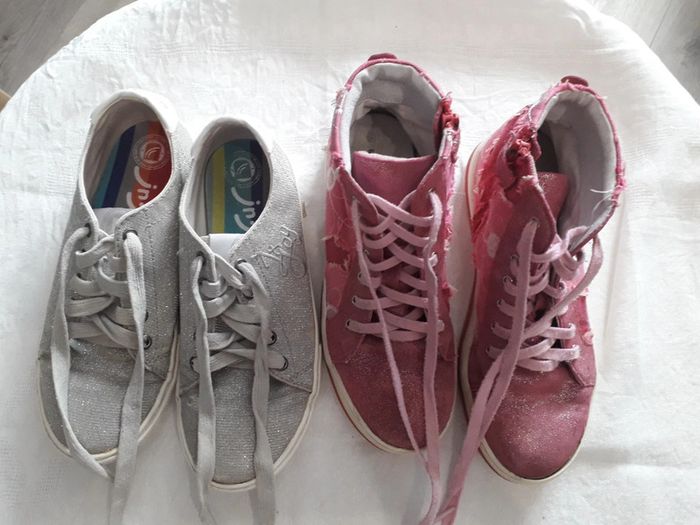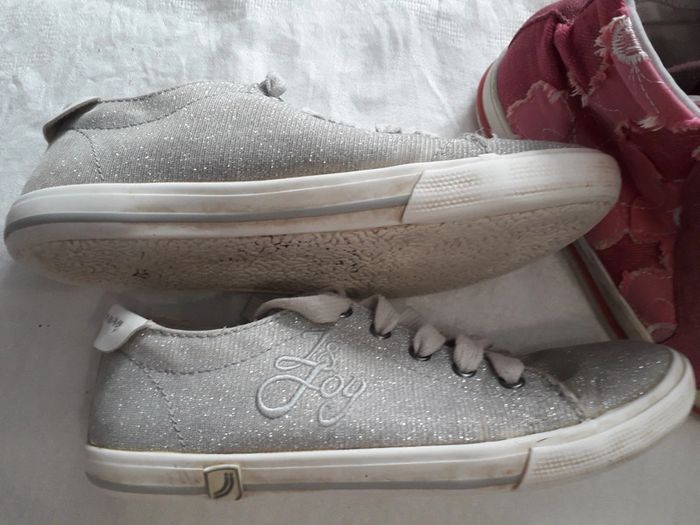 1 paire montante rose cuir pailleté et tissu, fermeture éclaire sur côté, semelles intérieures cuir, marque Lealelo, portées mais en bon état 1 paire basse légère en tissu argenté, portées mais en bon état juste 1 petit accro sur avant pied gauche (voir photo), marque JnJoy