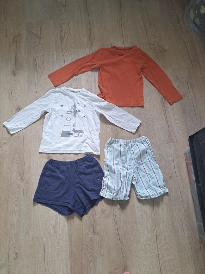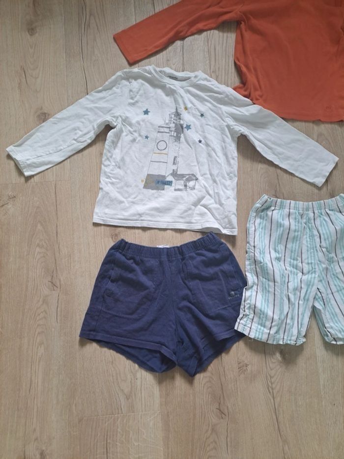 #loluxiagarcon8ans Lot de 4 pièces pour pyjama : 1 haut manches longues Vert Baudet blanc crème thème marin, TBE 1 haut manches longues NKY 8ans Orange, TBE 1 short bleu marine Décathlon, BE 1 short blanc rayé bleu et gris, In extenso BE (mini trou derrière, élastique sorti intérieur taille pour reglage pas de taille)