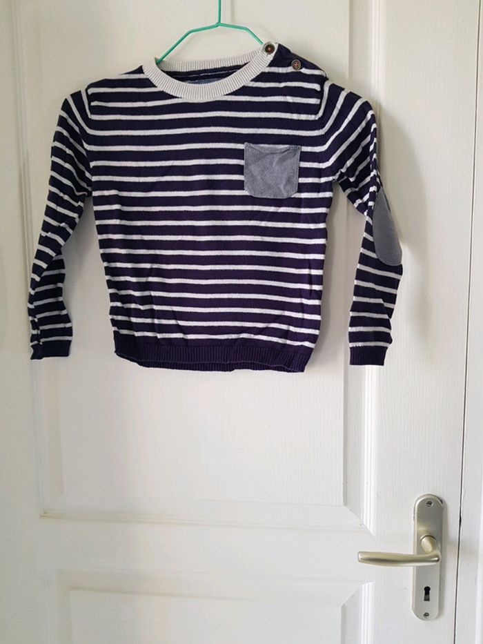 Pull rayé bleu marine et blanc avec une poche grise sur l avant et renforts gris au niveau des coudes. Taille 5/6 ans