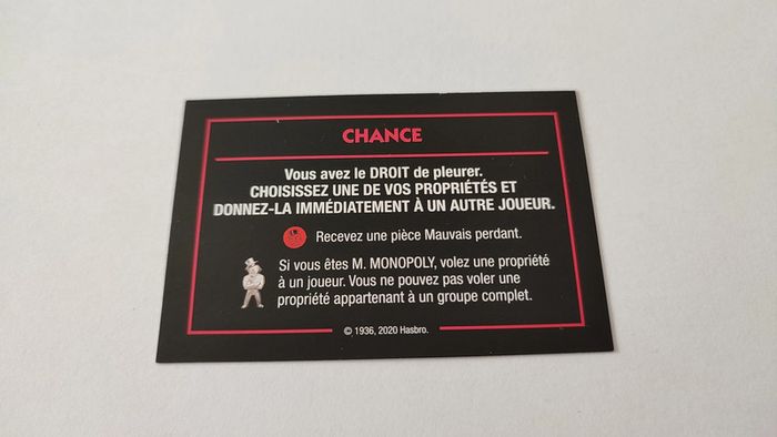 Carte Chance Droit de pleurer jeu de société Monopoly mauvais perdants Hasbro Gaming #B77