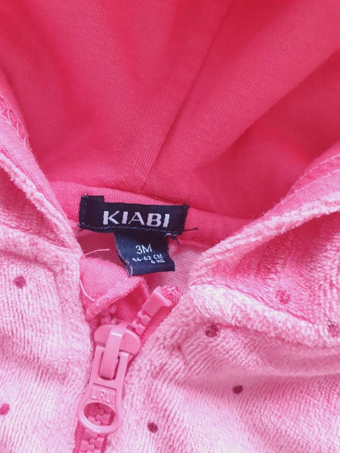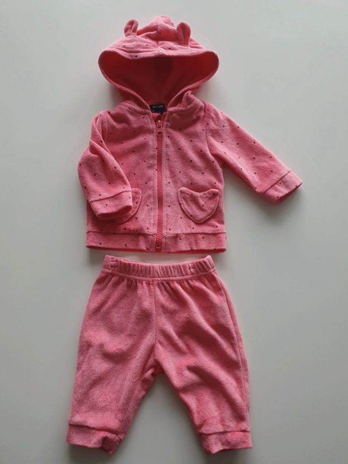 Mignon petit jogging fille en velours Kiabi Taille 3 mois Composé d'une veste zippée à capuche et 2 petites poches en forme de cœur D'un pantalon à taille élastique Coloris rose (plus joli et plus clair que sur la photo) Très peu porté
