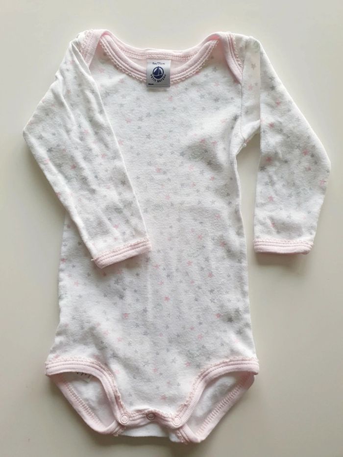 Body manches longues Petit Bateau Taille 9 mois Coloris blanc avec étoiles et liseré rose clair Très bon état