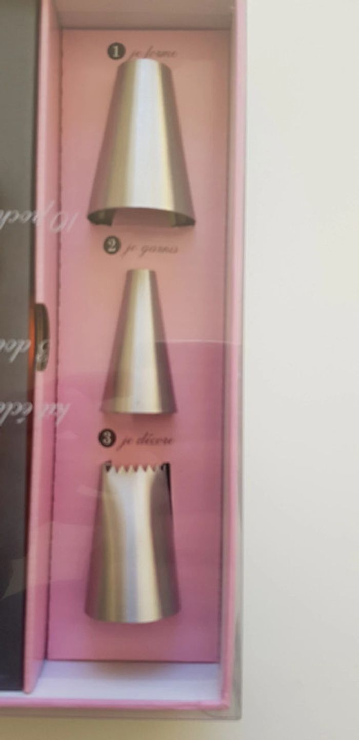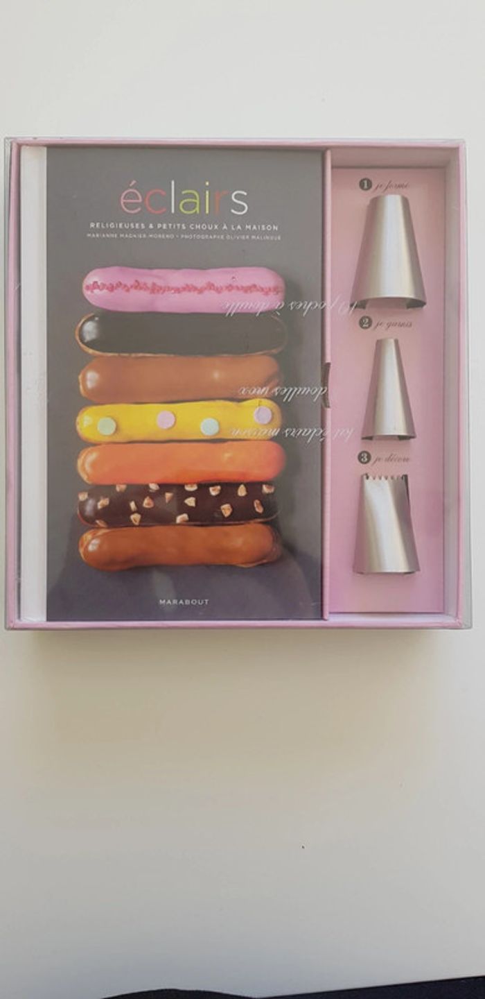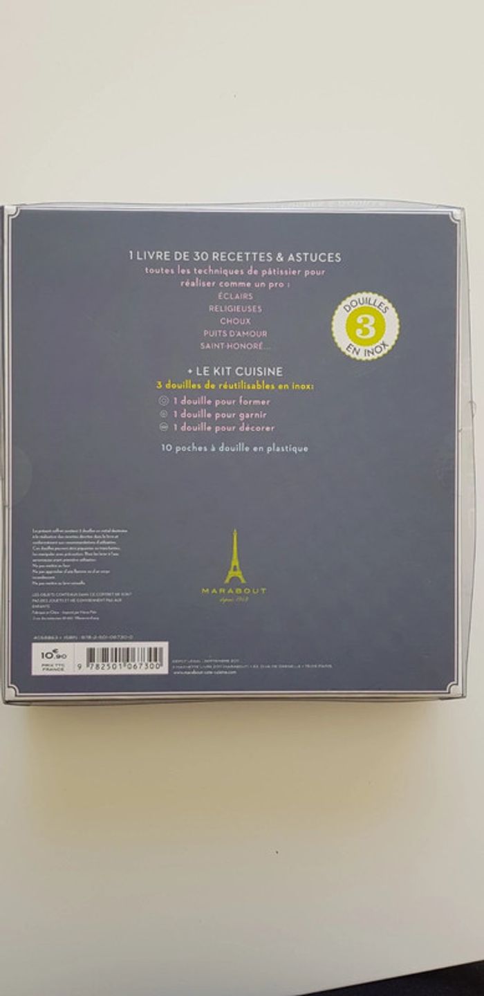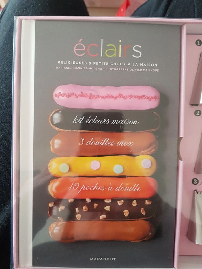 Coffret Eclairs, religieuses & petits choux a la maison Contient 1 livre de 30 recettes, 3 douilles, 10 poches a douille Neuf, je ne m'en suis jamais servi. Juste descotché
