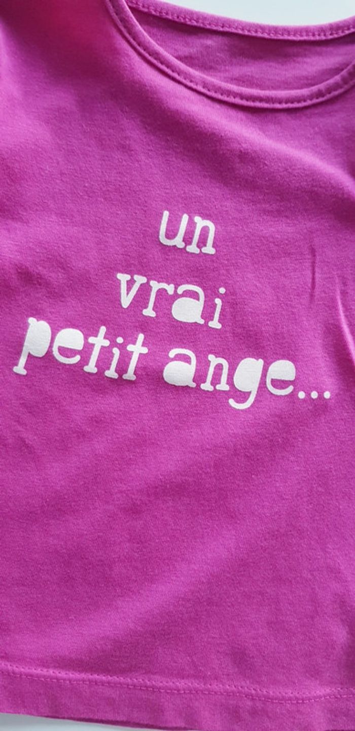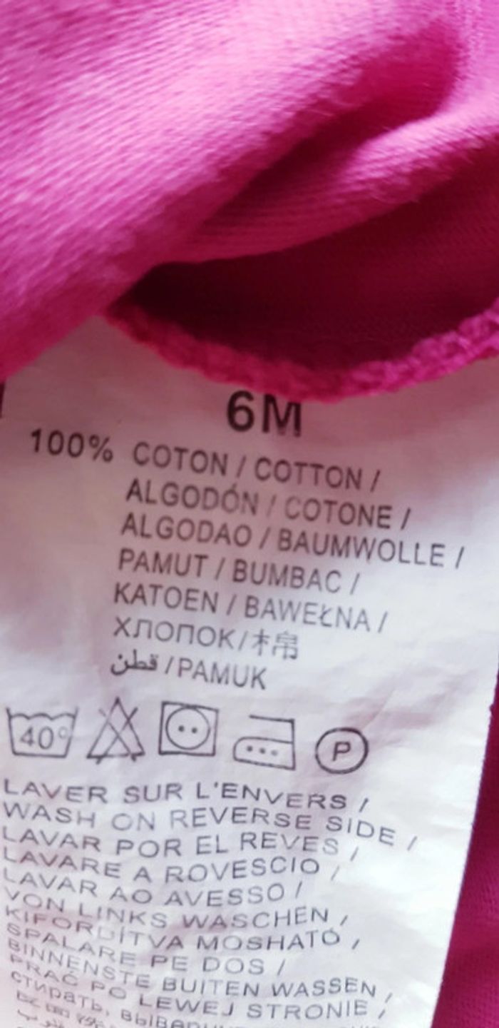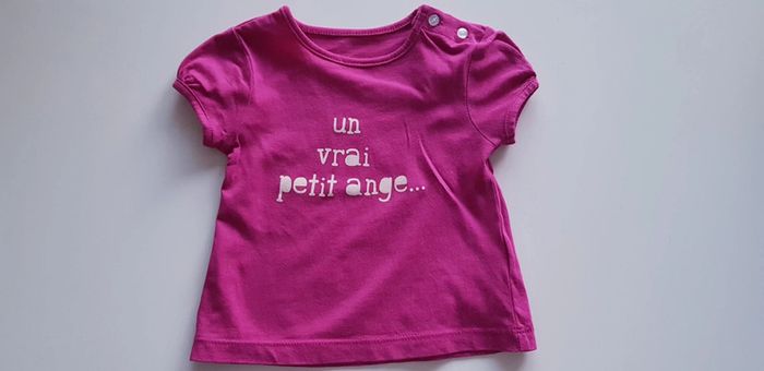 Tee-shirt Kiabi Taille 6 mois Coloris violet rose avec inscription 2 boutons sur l'épaule gauche Très bon état