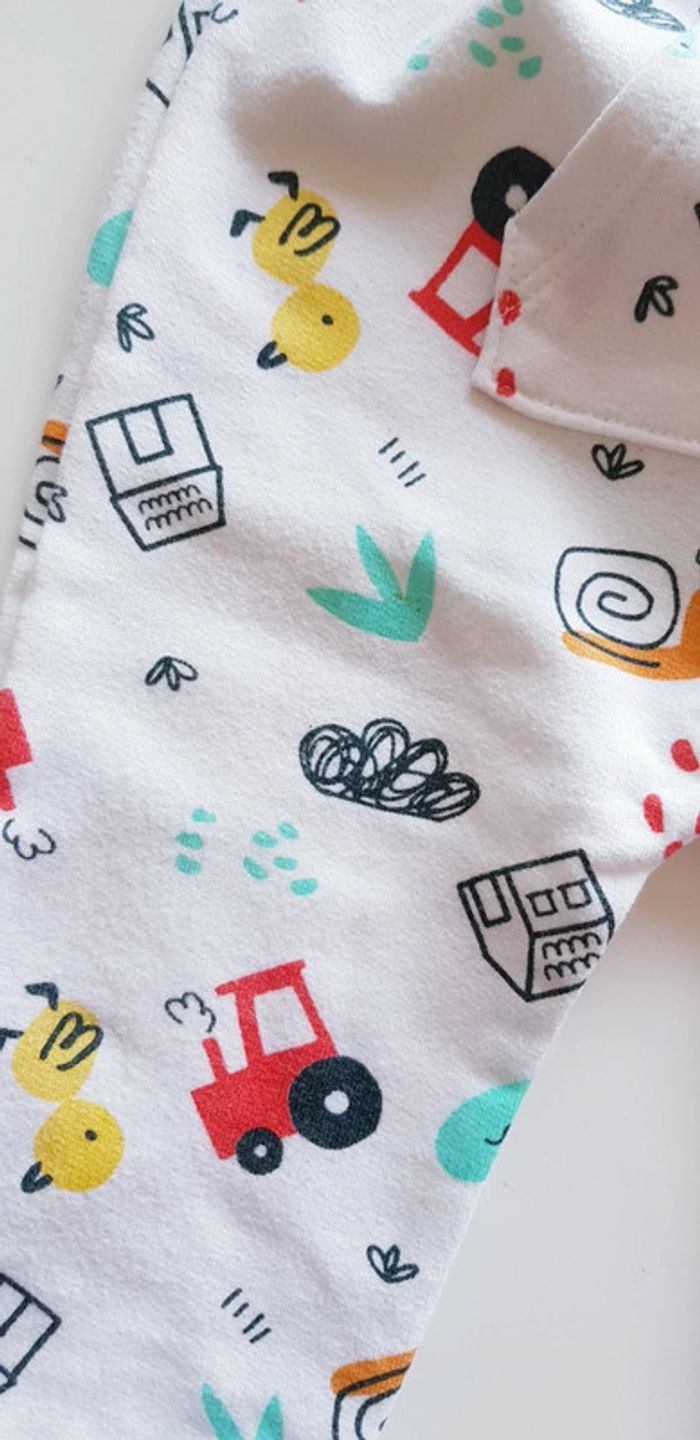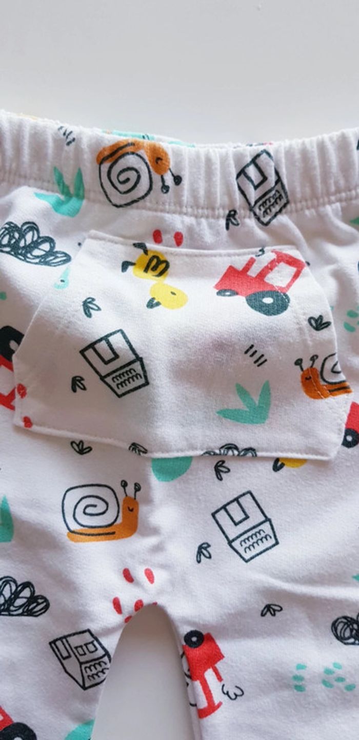 Pantalon Mots d'enfants Taille 6 mois Une poche centrale Blanc a motifs colorés Revers sur le bas, taille élastique Très bon état