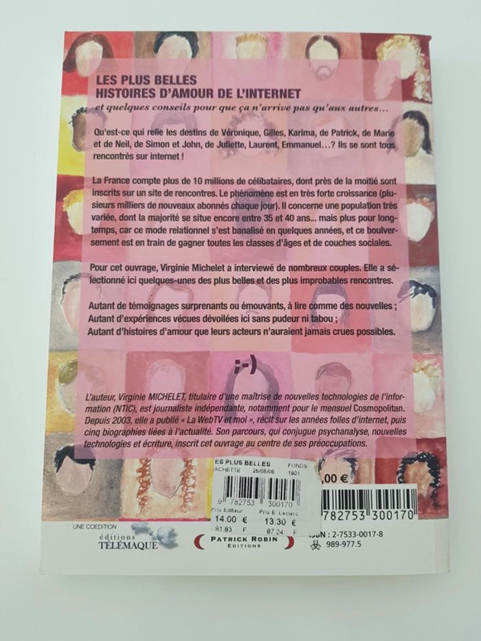 Livre "Les plus belles histoires d'amour de l'internet..." de Virginie Michelet Neuf, jamais lu ⚠️ trait du probablement a un coup de cutter, présent lors de l'achat en grande surface. Mais ne se voit pas trop (voir dernière photo au dessus du nom de l auteur)