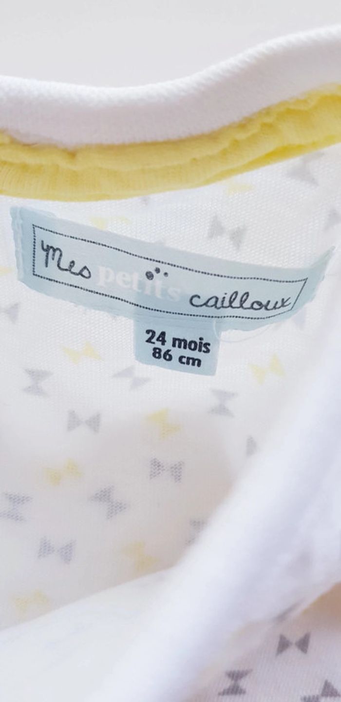 Tee-shirt Mes petits cailloux Taille 24 mois Coloris blanc avec motifs gris/jaune Très bon état