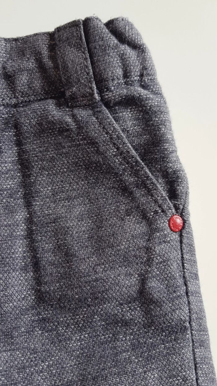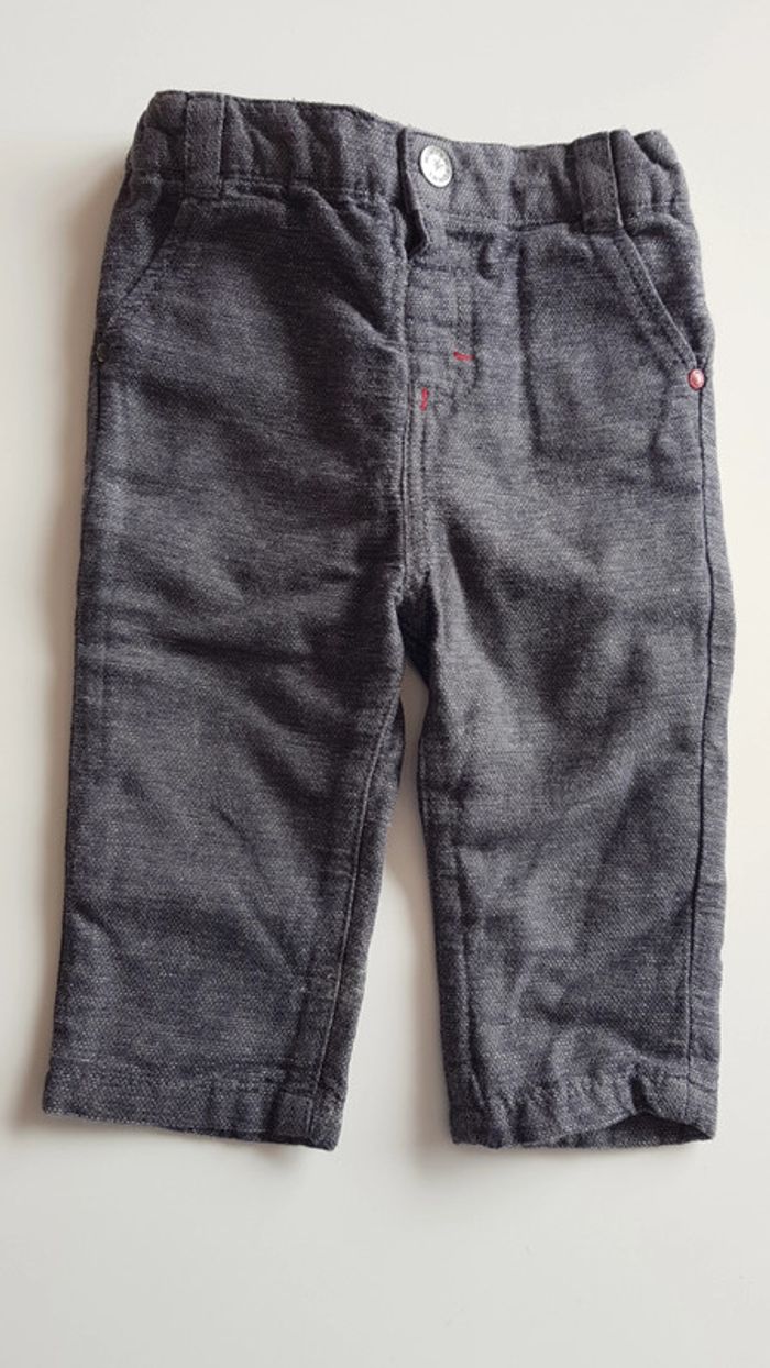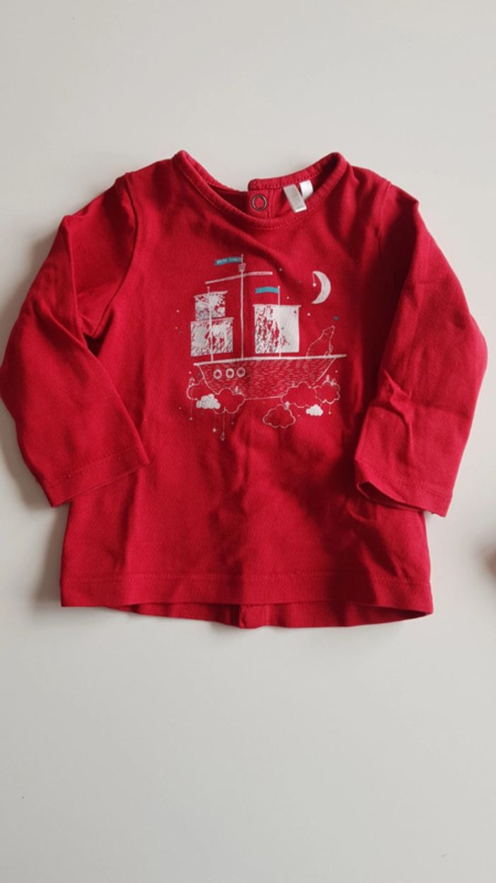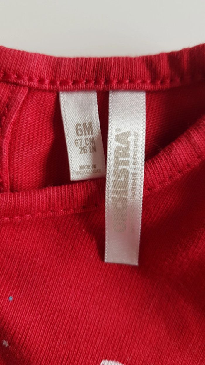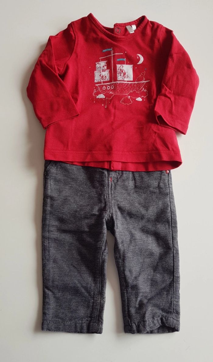Ensemble Orchestra, composé : - d'un pantalon gris, ni fin ni epais. Bouton + taille réglable. 2 poches latérales - d'un tee-shirt manches longues rouge.(un leu plus foncé que sur la photo) a motif. Boutonnage intégral au dos par boutons pressions Taille 6 mois Très bon état, porté quelques fois seulement