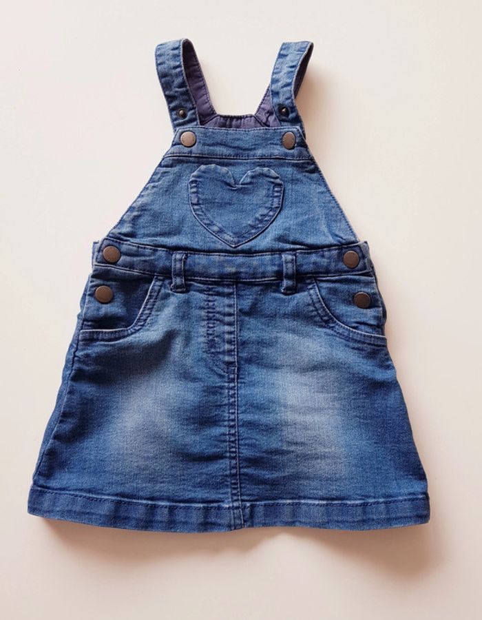 Robe en jean marque DP... AM Taille 18 mois Bretelles réglables 2 boutons de chaque côté Petite poche en forme de coeur au niveau de la poitrine + 2 poches latérales Possibilité de rajouter une ceinture La robe peut se porter en hiver avec un sous pull ou en été avec un débardeur ou tee shirt manches courtes Excellent état
