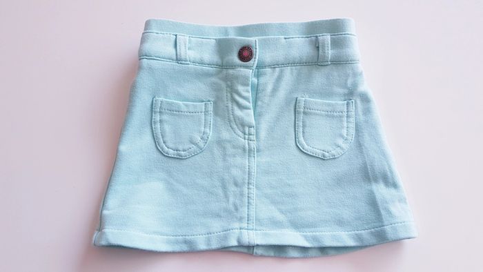 Petite jupe fille Tex Baby Taille 18 mois Coloris vert d'eau (et non pas bleu comme peut le laisser penser la photo) 2 poches sur le devant Taille non réglable Tres peu portée