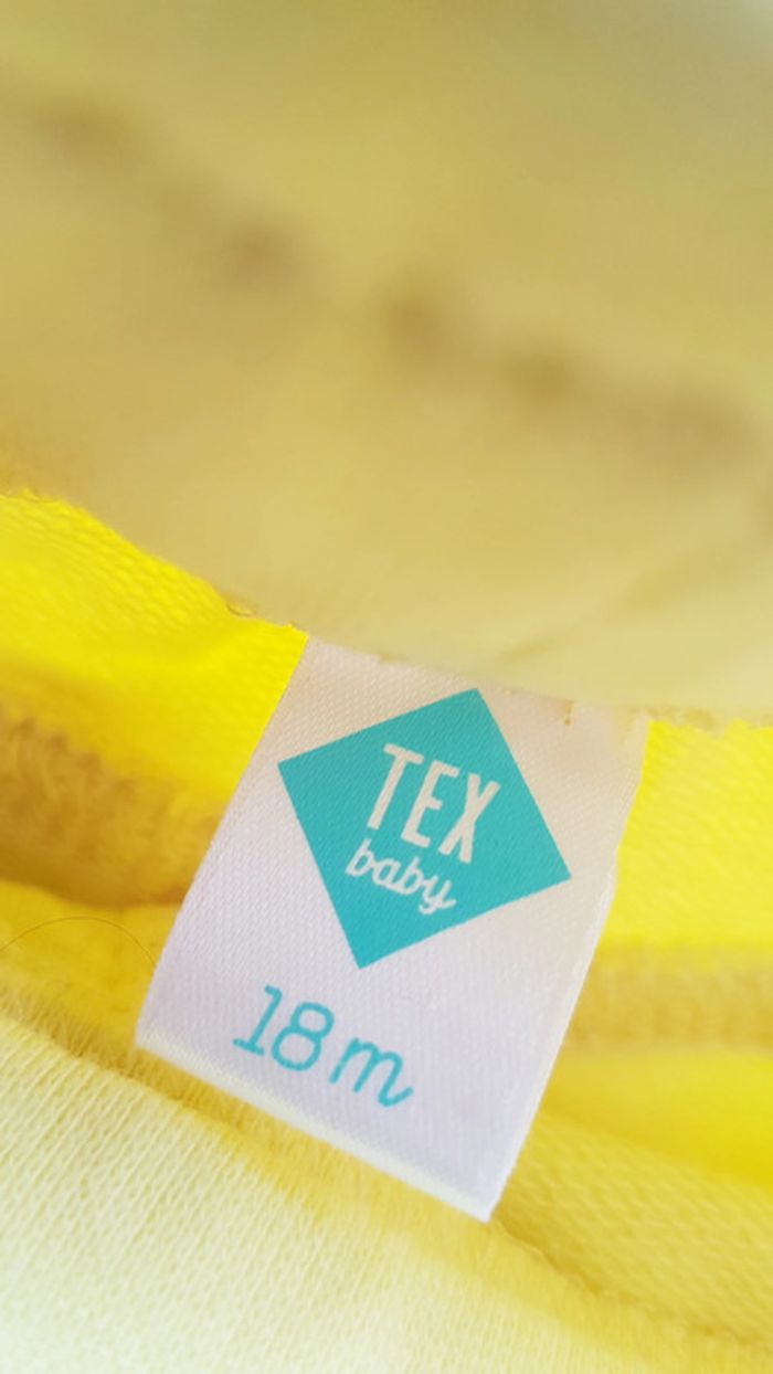 Jupe Tex Baby Taille 18 mois Coloris jaune 2 poches sur le devant Taille non réglable 2 petits defauts presents (voir 2 dernieres photos) mais pas visible au 1er regard Tres peu portée