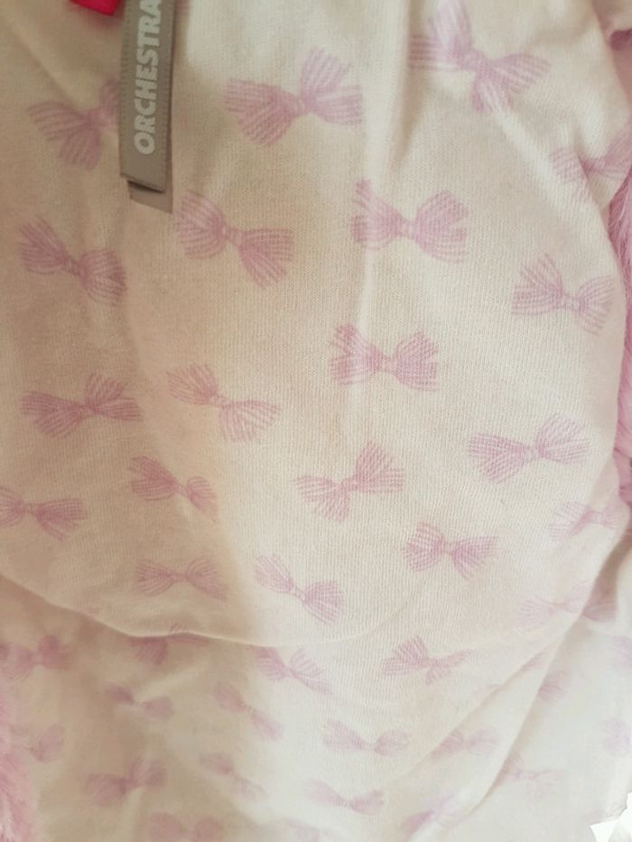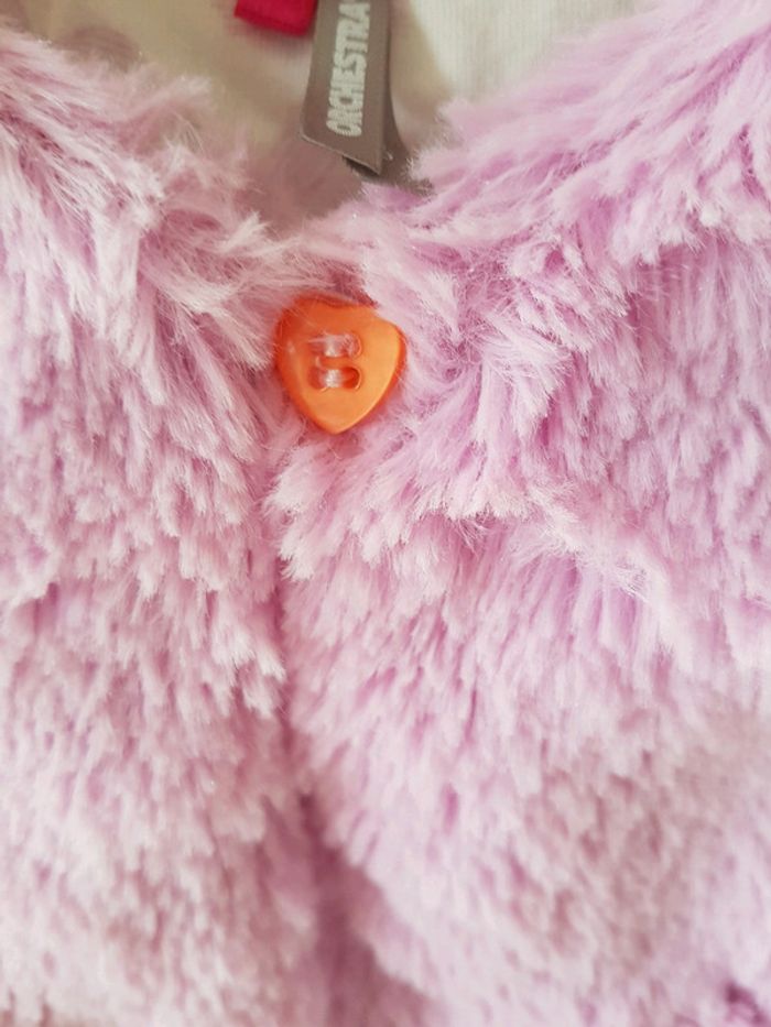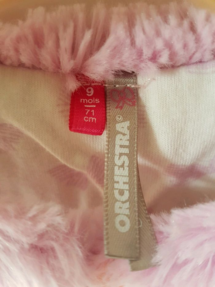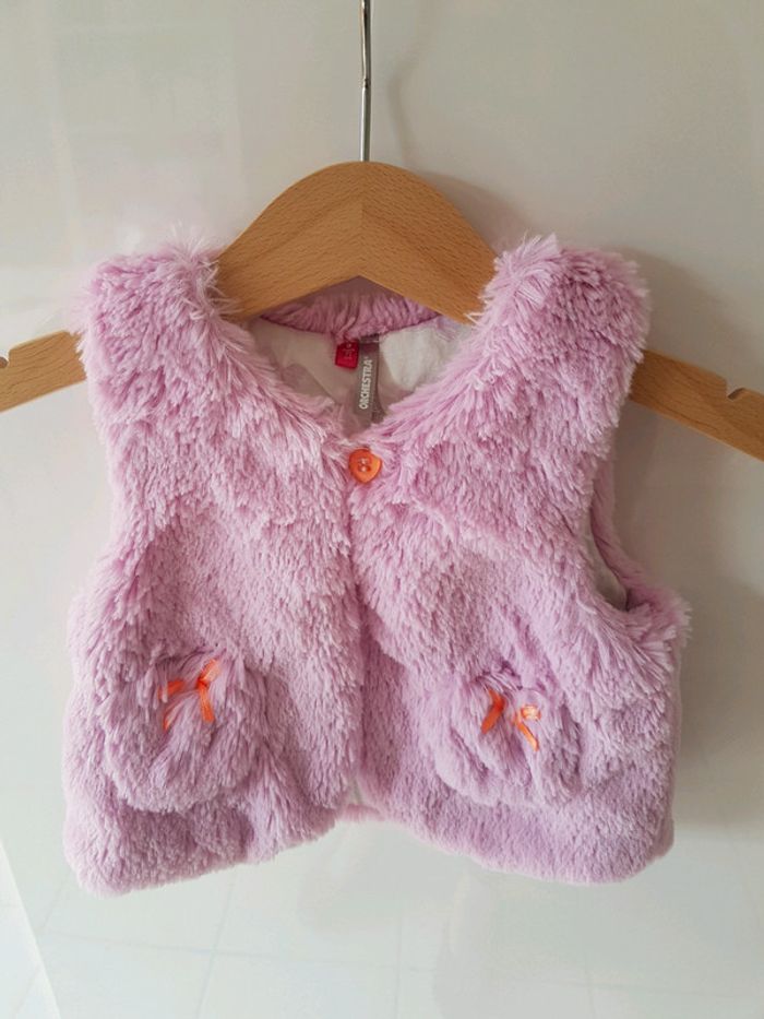 Gilet sans manches Orchestra Taille 9 mois Coloris lilas 2 petites poches avec sur chacune un noeud orange Fermeture par un bouton orange en forme de coeur Très bon etat, très peu porté