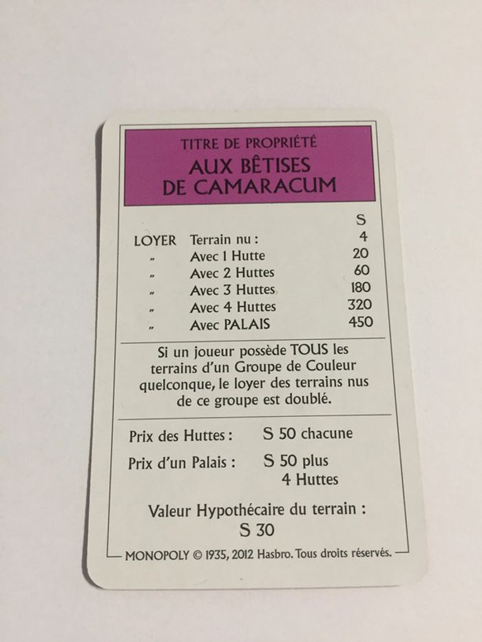Carte Aux bêtises de camaracum pièce jeu de société Monopoly le tour de Gaule d'Astérix Hasbro #A53 - photo numéro 1