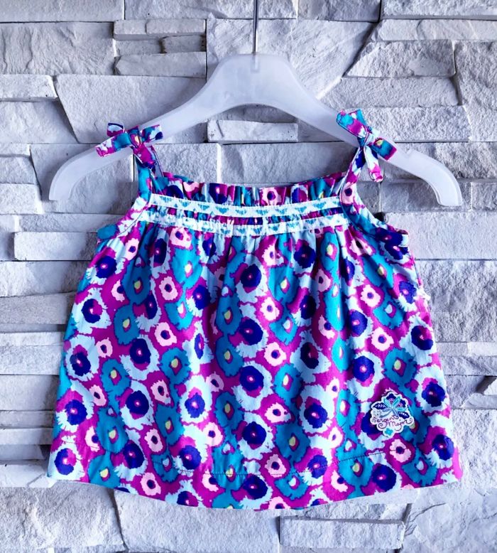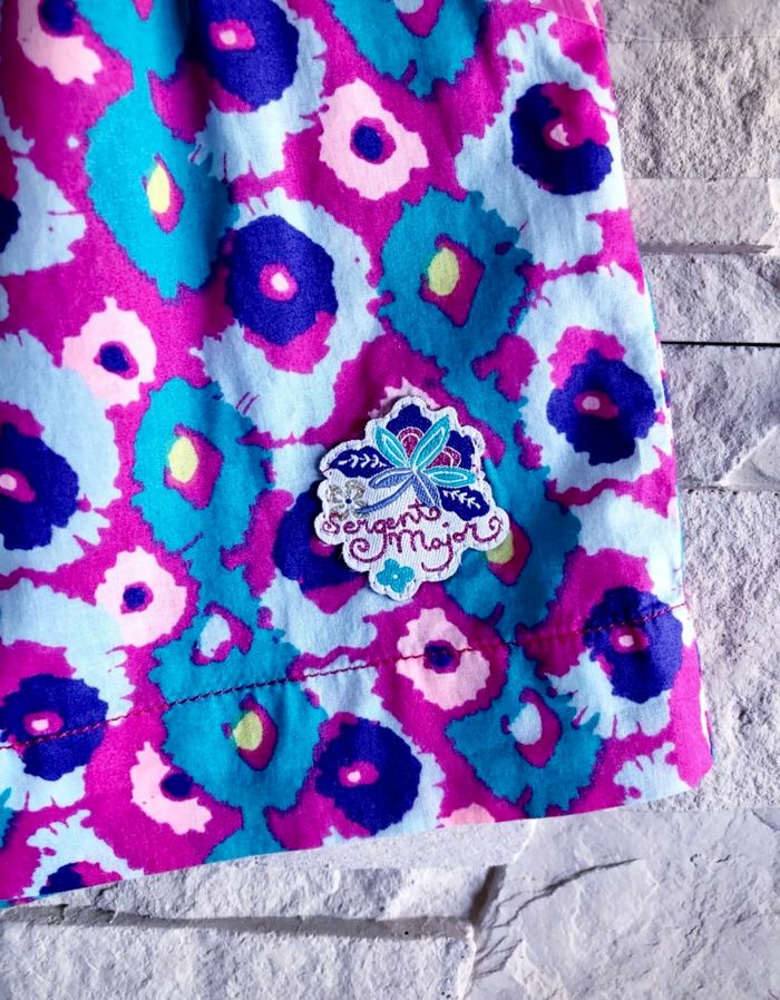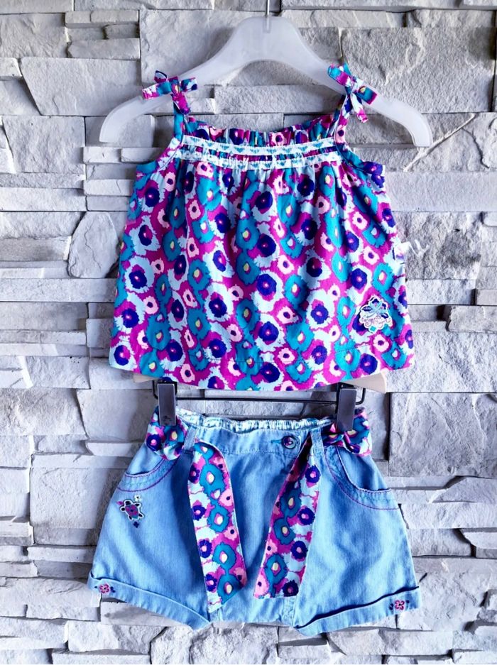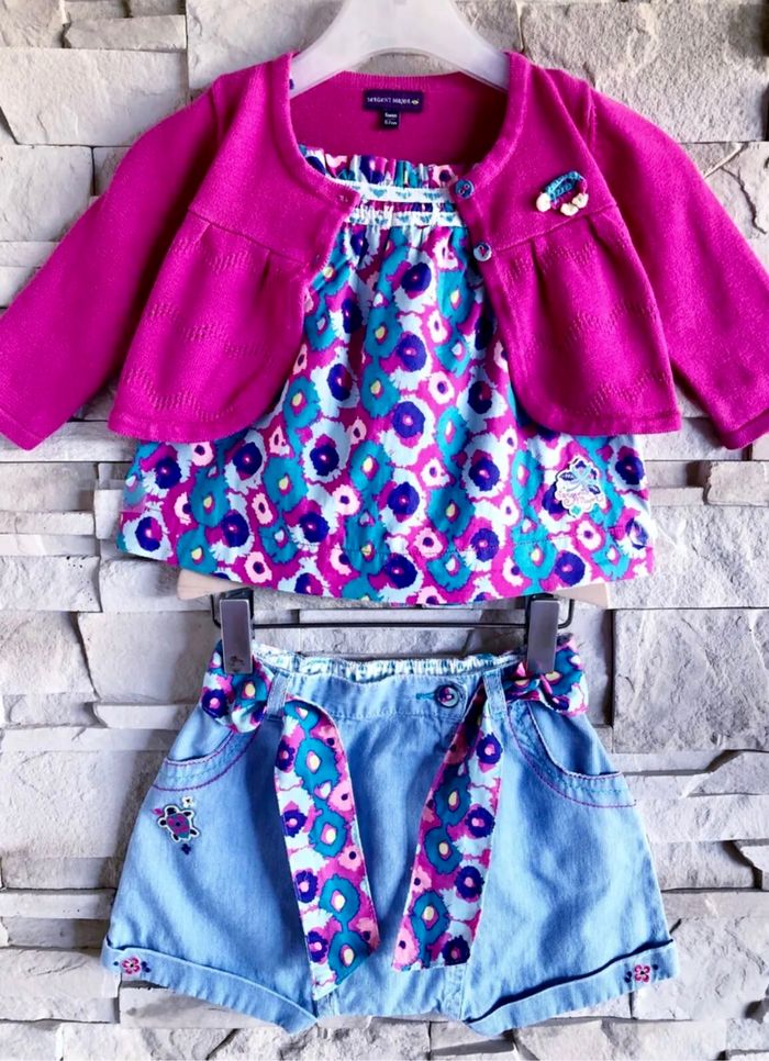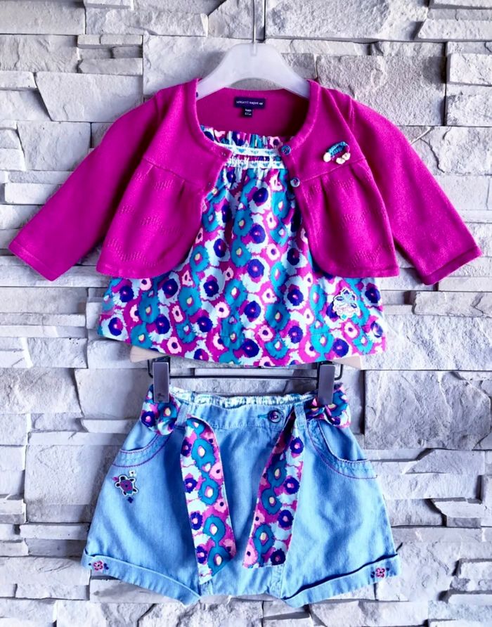 MARQUE : SERGENT MAJOR... ETAT : COMME NEUF !!! TAILLE* : 9 MOIS OU STATURE 71 CM *Tout est en 9M sauf Gilet 6M mais Porté en même temps COLORIS : FUSCHIA + BLEU CLAIR + VIOLET... COMPOSITION : 100% COTON MOTIF : FLEURS PARTICULARITÉS : - Ornements Broderies & Empiècement Tortue sur Short - Point Ajouré Fantaisie pour Gilet - Contraste de Teintes Lumineuses