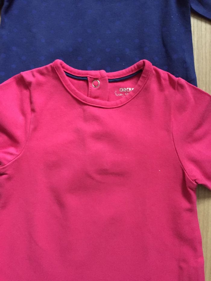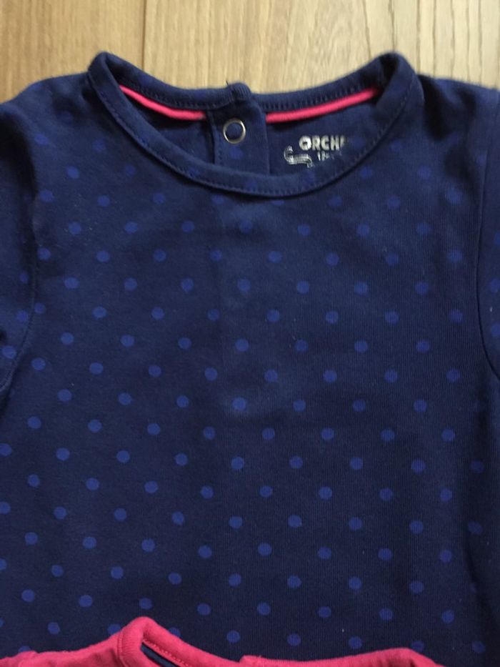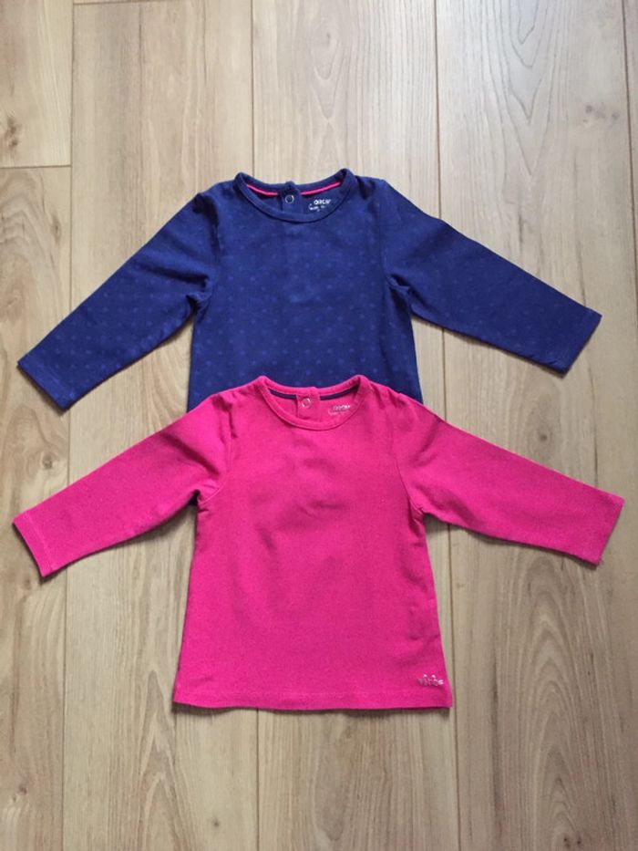 fille12moisjoelle33130 2 tee-shirts manches longues 12 mois de chez 0rchestra 1 bleu marine à pois et un fuchsia En excellent état