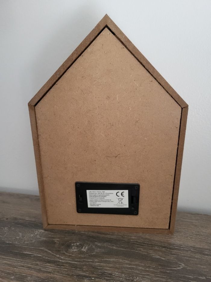 Petite décoration lumineuse en bois Forme maison Dimensions largeur 17 cm hauteur 24,5 cm Fonctionne avec 2 piles NON FOURNIES petit bouton marche arrêt au niveau de boîtier piles Très bon état