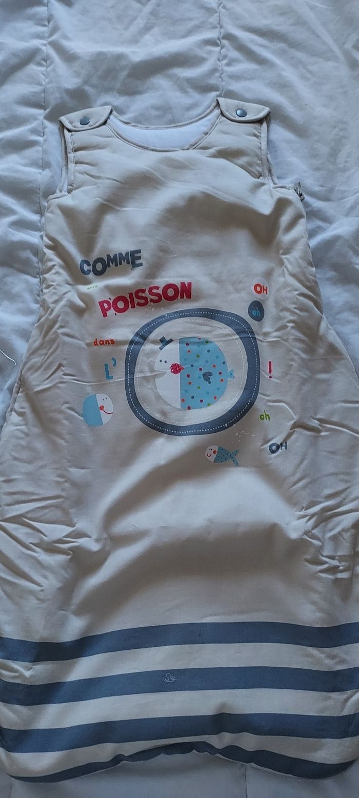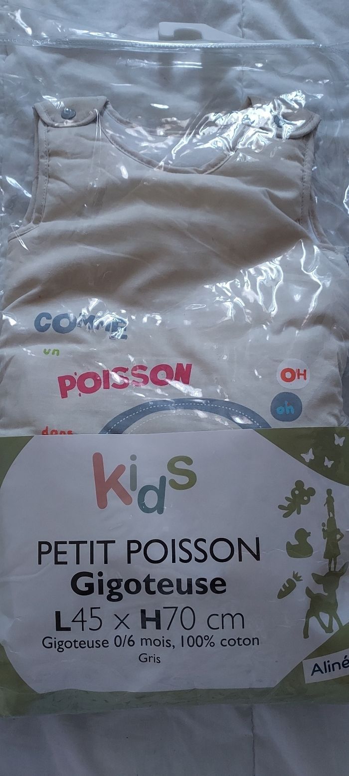 Gigoteuse neuve de la marque Alinéa Kids, motif sur le devant 1 poisson, couleur beige en taille 0/ 6 mois. 100% coton. Mi saison et hiver.