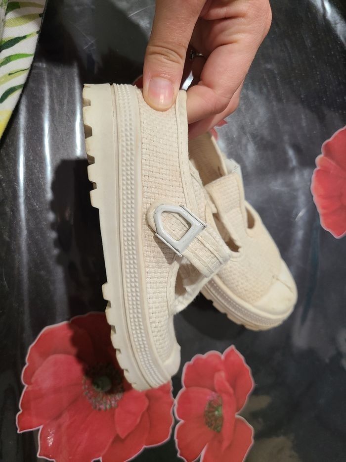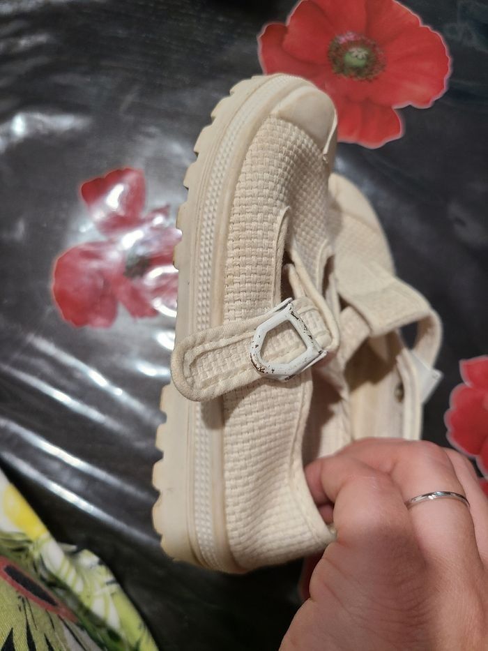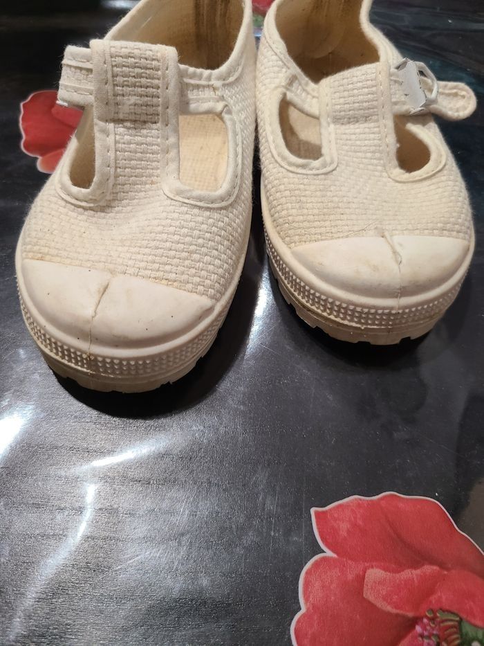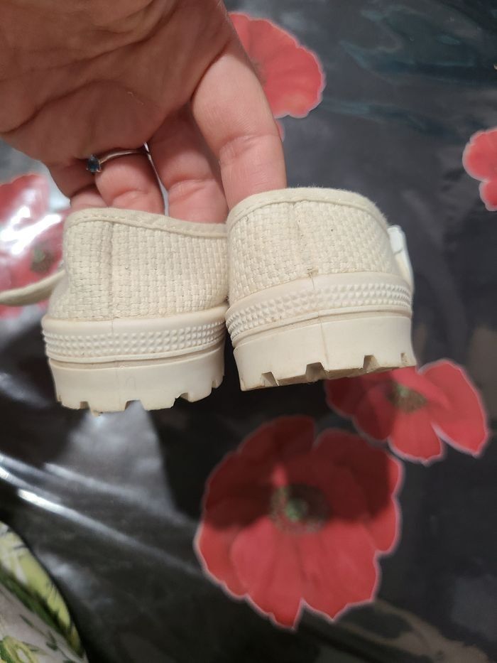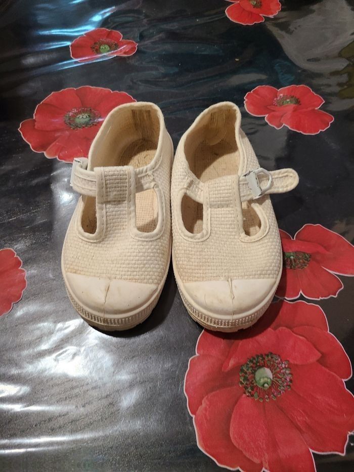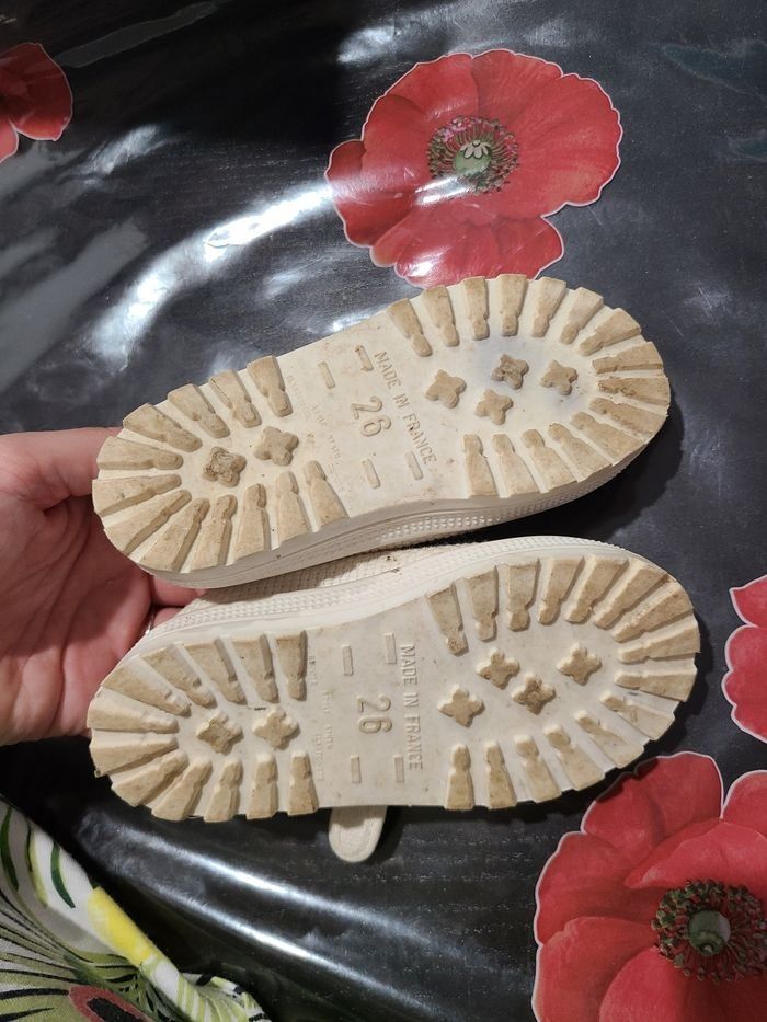 Chaussure 26 Blanche (blanc sale) passé en machine mais pas laver à la main ni frotté Sinon elle sont en très bon état pas de marque d'usure seulement salissure MADE IN FRANCE