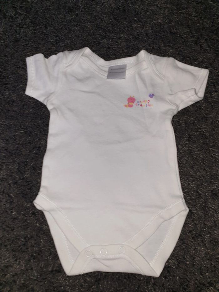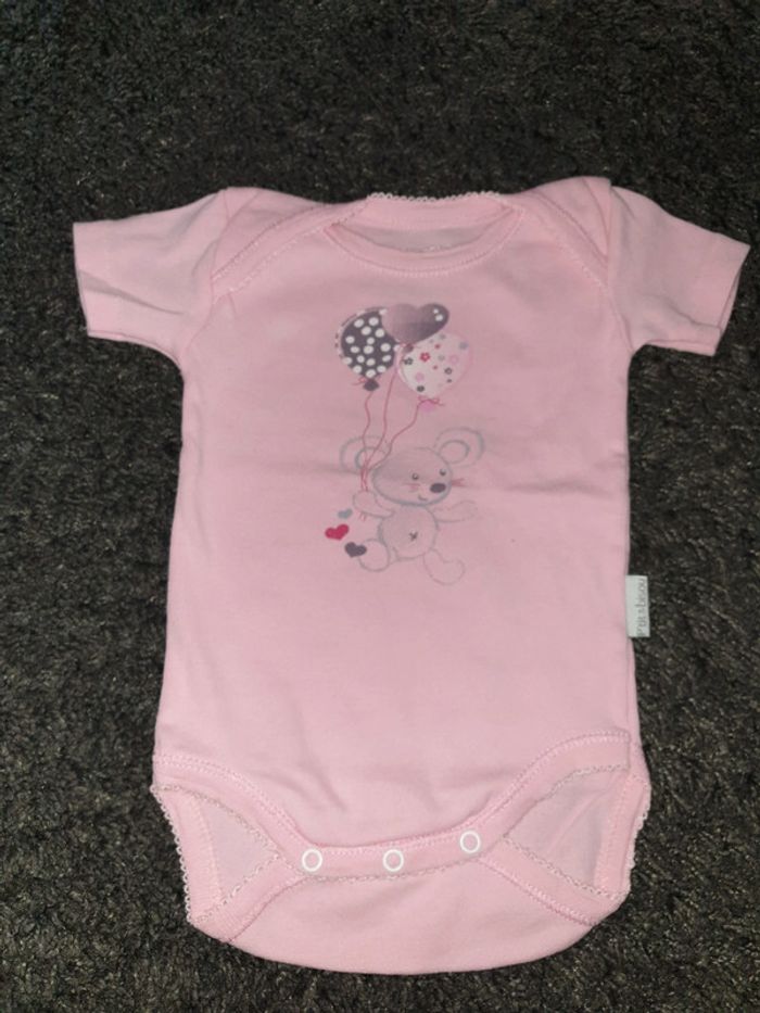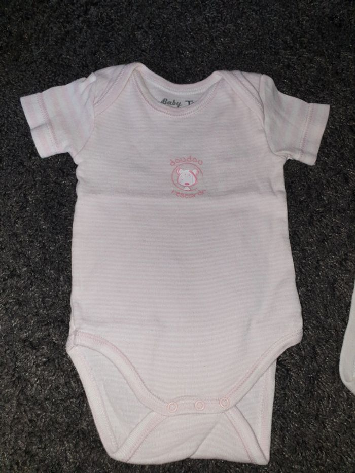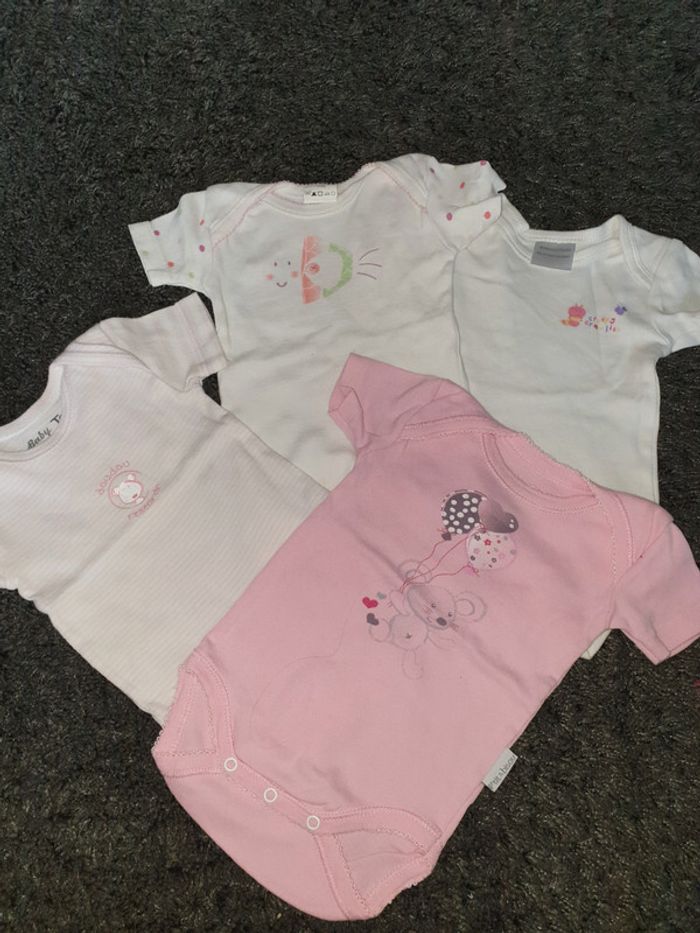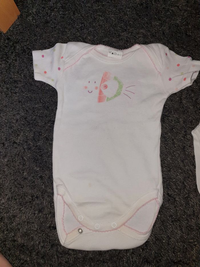 Lot de 4 bodies fille manches courtes 3 mois de différentes marques en parfait état, sauf le poisson qui est taché à l'entrejambe - rose : p'tit bisous - rose rayé : tex - poisson : mots d'enfants - blanc : Zeeman #3moissevy57