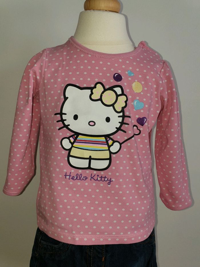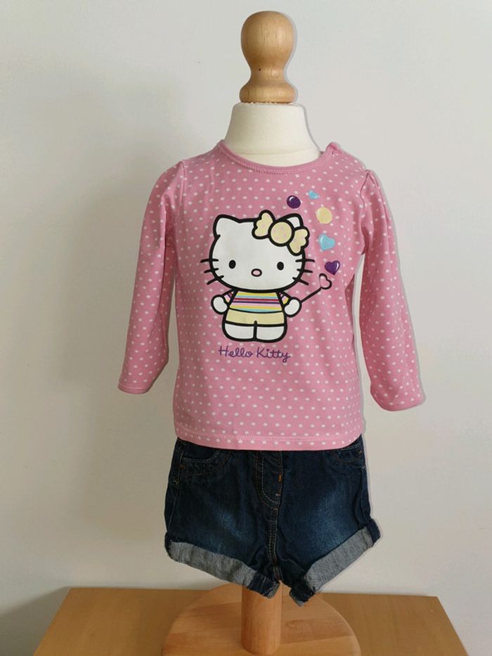 Joli ensemble comme neuf composé d'un T-shirt manches longues H&M Helll Kitty et d'un short en en jean brut Kiabi 12 mois