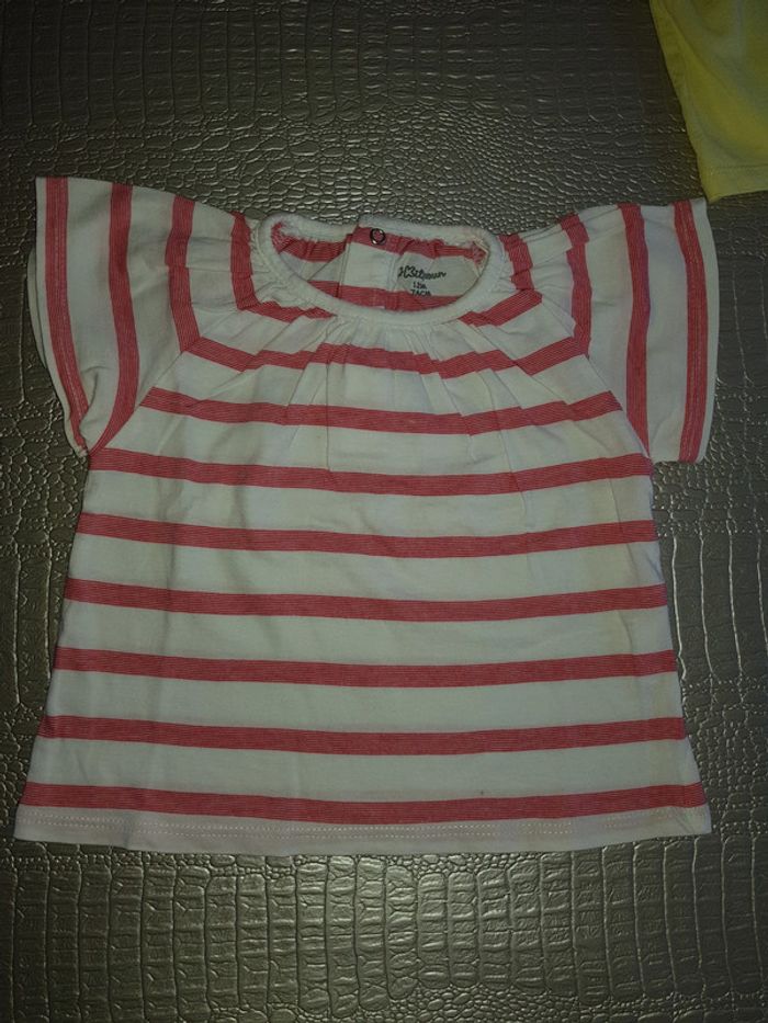 Lot de 2 t-shirts manches courtes en parfait état (Kitchoun) - 1 blanc rayures rose - 1 vert anis 12 mois