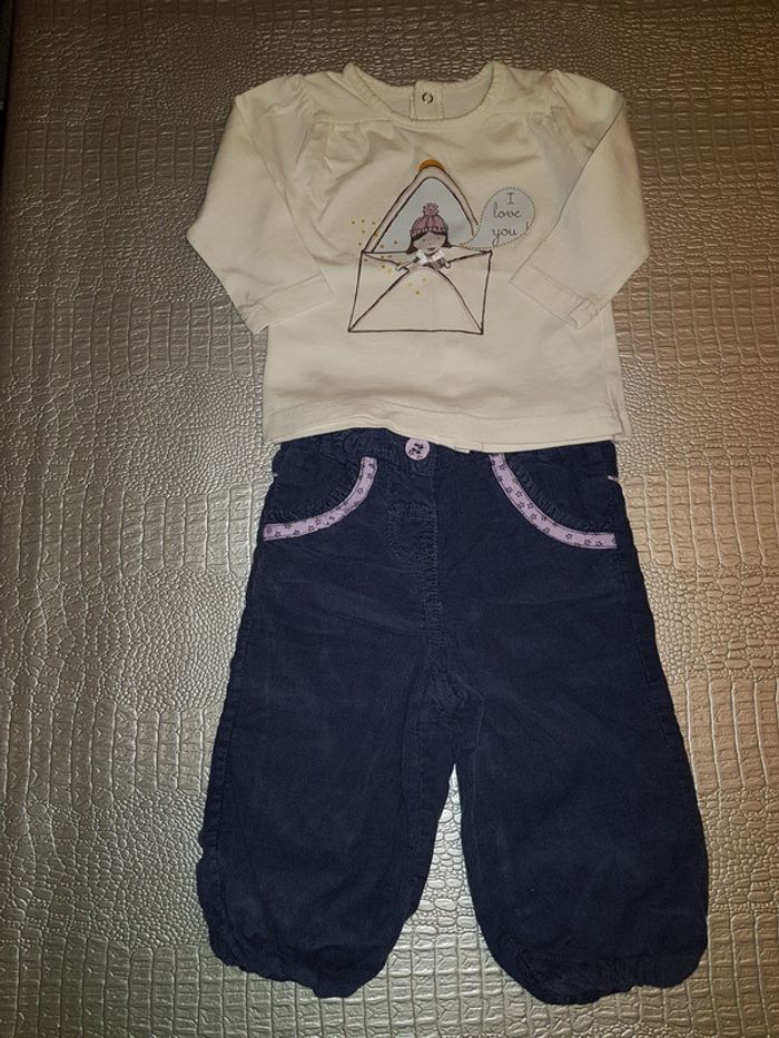 Ensemble en parfait état de marque Tape à l'oeil Le T-shirt couleur crème est dans un etat neuf (porté 1 fois), le pantalon doublé est en velours est en tbe Taille 9 mois #9moissevy57
