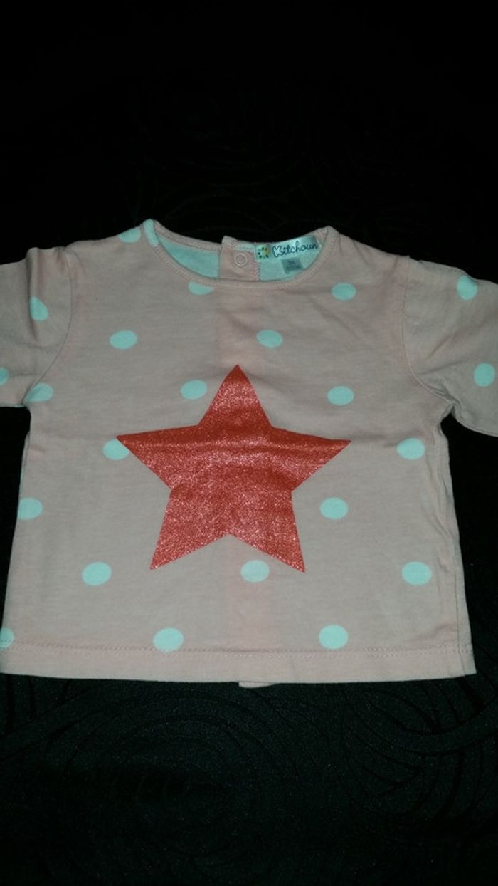 Jegging brut très élastique (Gemo) et t-shirt manches longues comme neuf rose à pois avec une grosse étoile pailletté sur le devant, entièrement boutonné sur l'arrière (kiabi) Taille 3 mois