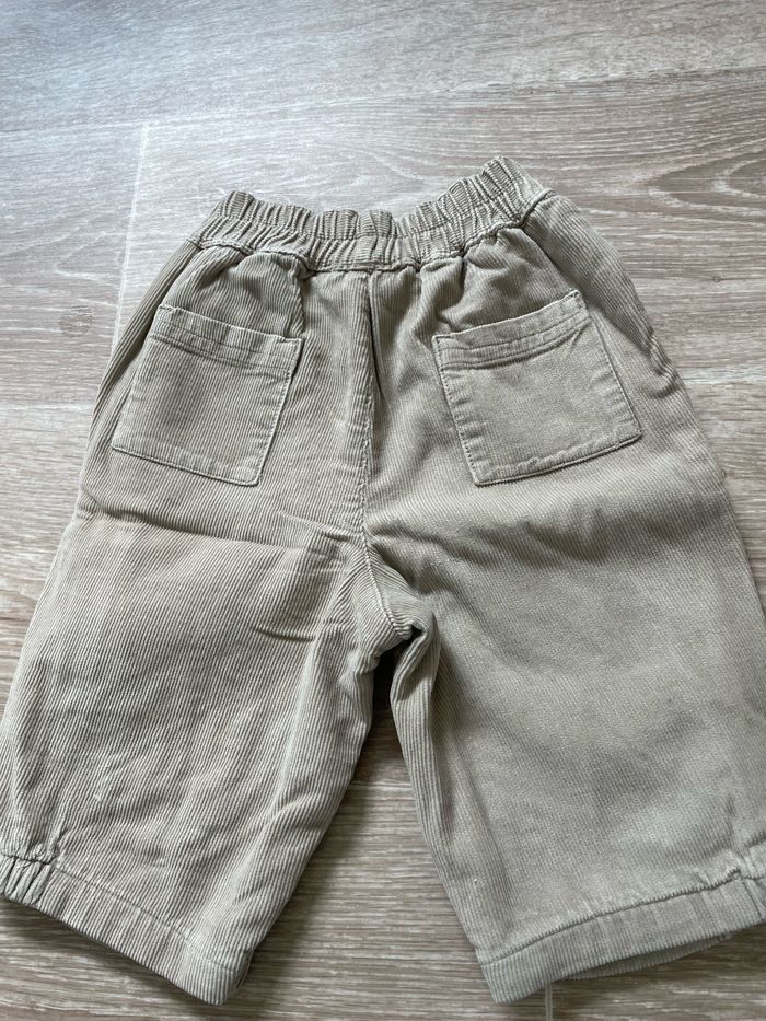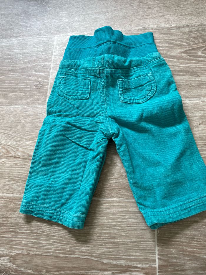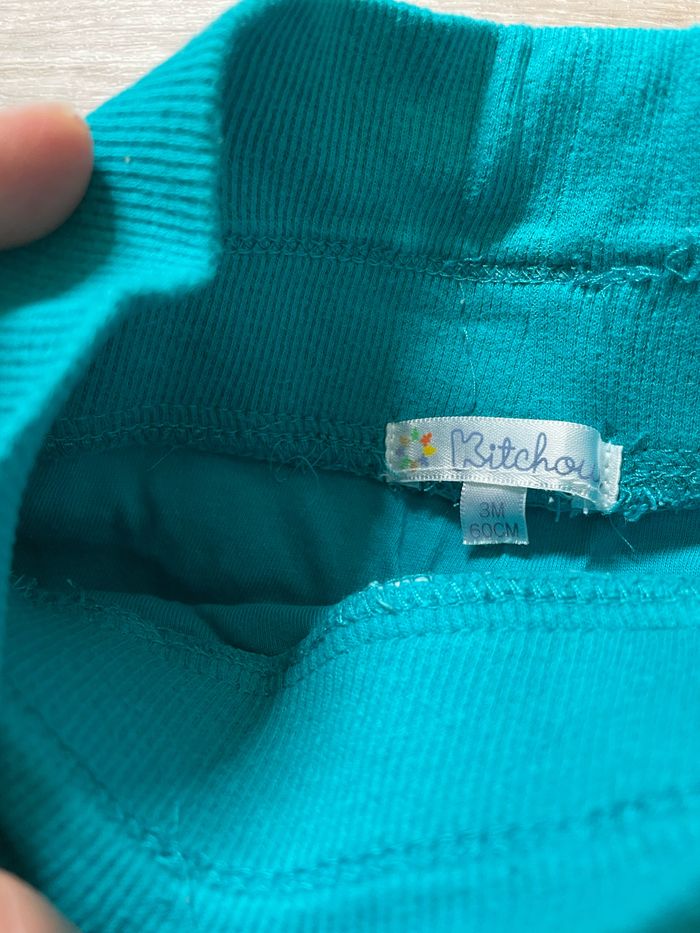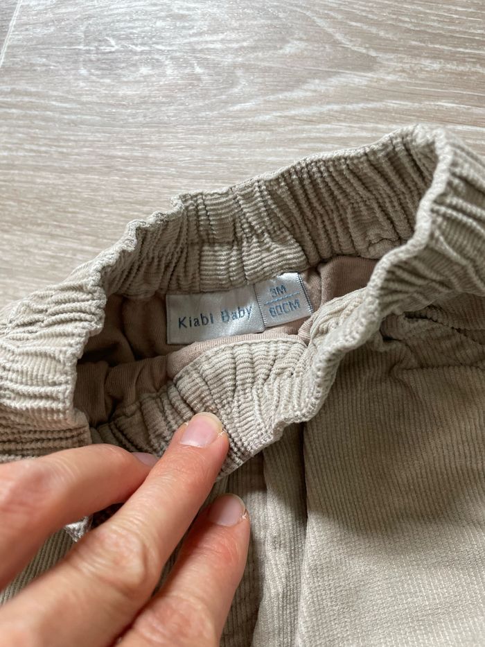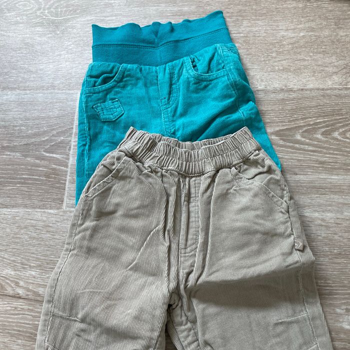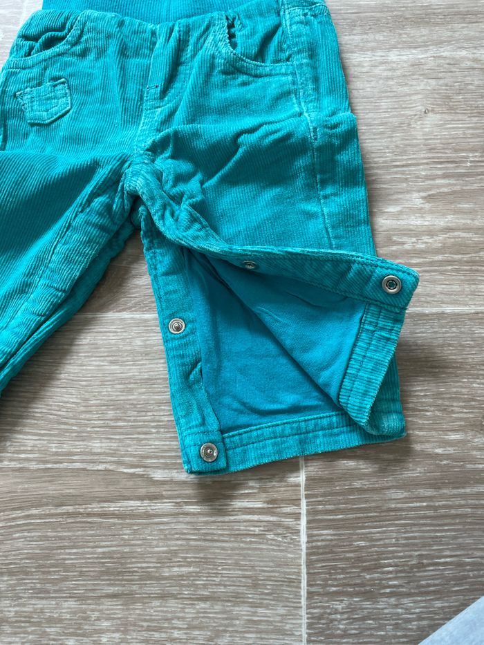 Lot de deux pantalons velours, taille trois mois, un couleur beige de la marque Kiabi et l’autre bleu turquoise de la marque Kitchoun. En bon état. Les deux pantalons sont avec des pressions au niveau de l’entrejambe.