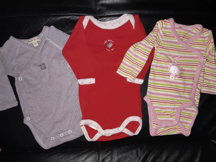 Lot bodys 3 mois. 1 petit bateau, 1 grain de blé et 1 où l'étiquette a été coupée donc je ne sais pas. Bon état général pas de tâches ni trous. #3moisfille
