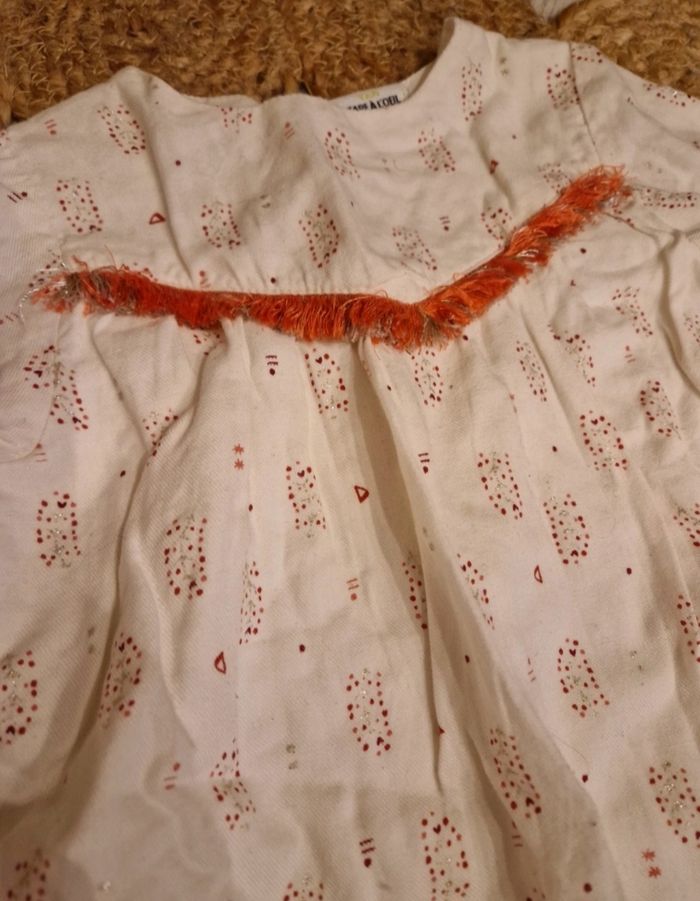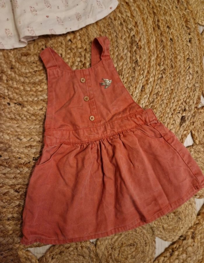 Lot de deux magnifiques robes dans le style bohème chic, nature. Une a manches longues vraiment très classe, peut être portée en toute circonstances selon les accessoires. Idéale pour fêtes ou evenements tel que mariage, bapteme, anniversaire ou autre. Coupe trapèze, frange sur le torse et petits motif, fond crème et motif corail, doré et bordeaux. Pressions dans le dos pour faciliter l'enfilage par la tête. La seconde est robe salopette rouge délavée avec un joli petit oiseau doré à paillettes. Bretelles croisées dans le dos, vraiment très mignonne et très classe. Le tout de chez Tape à l'œil en taille 9 mois. #dressingdeneva9mois #robetapealoeil9mois #robeboheme9mois #robeceremonie9mois #bebefille9mois #robe9mois #tao #tapealoeil #tapealoeilfille9mois #taofille9mois